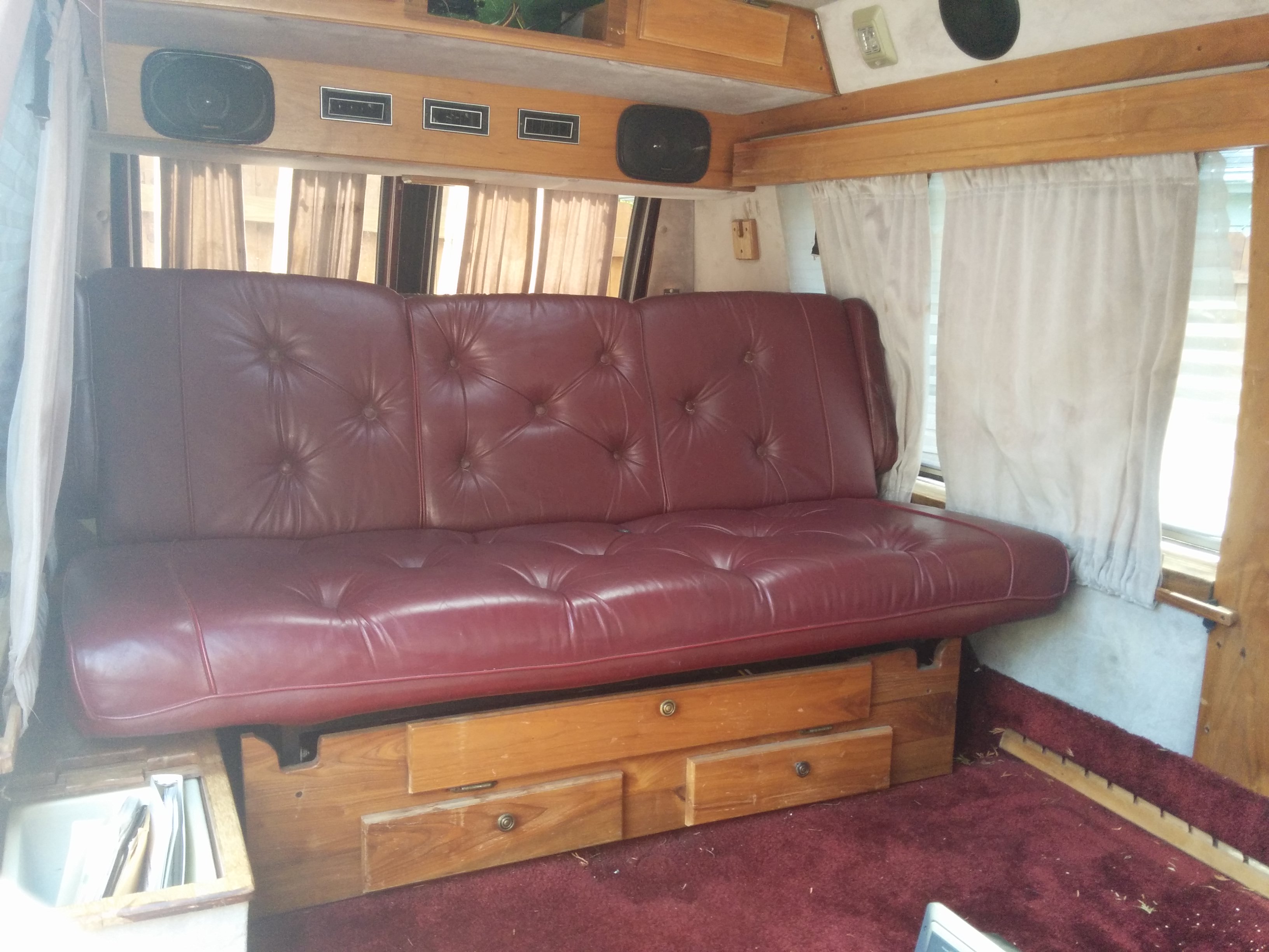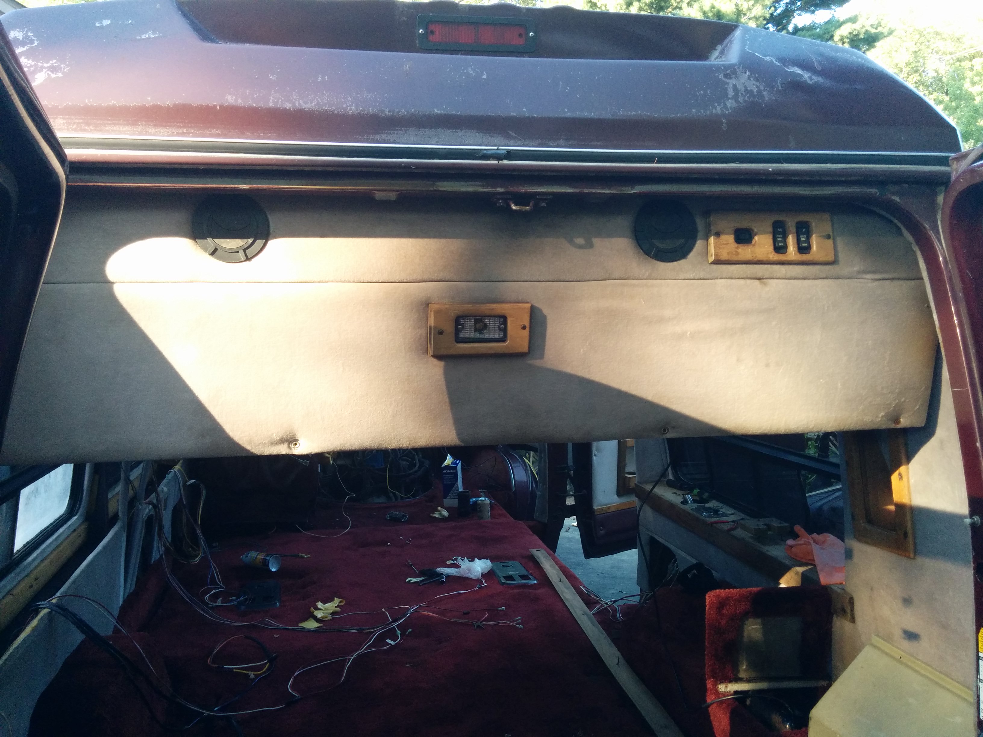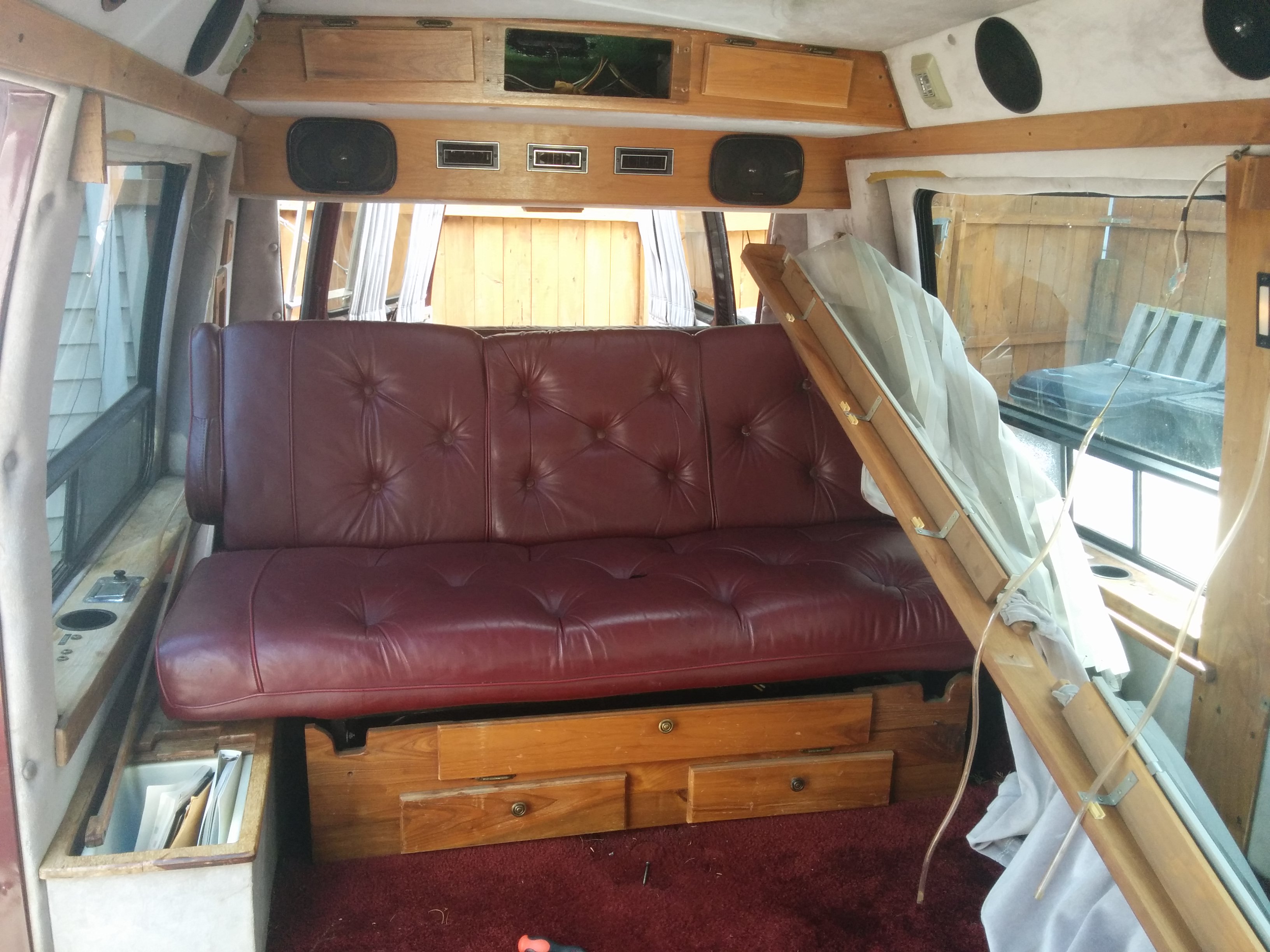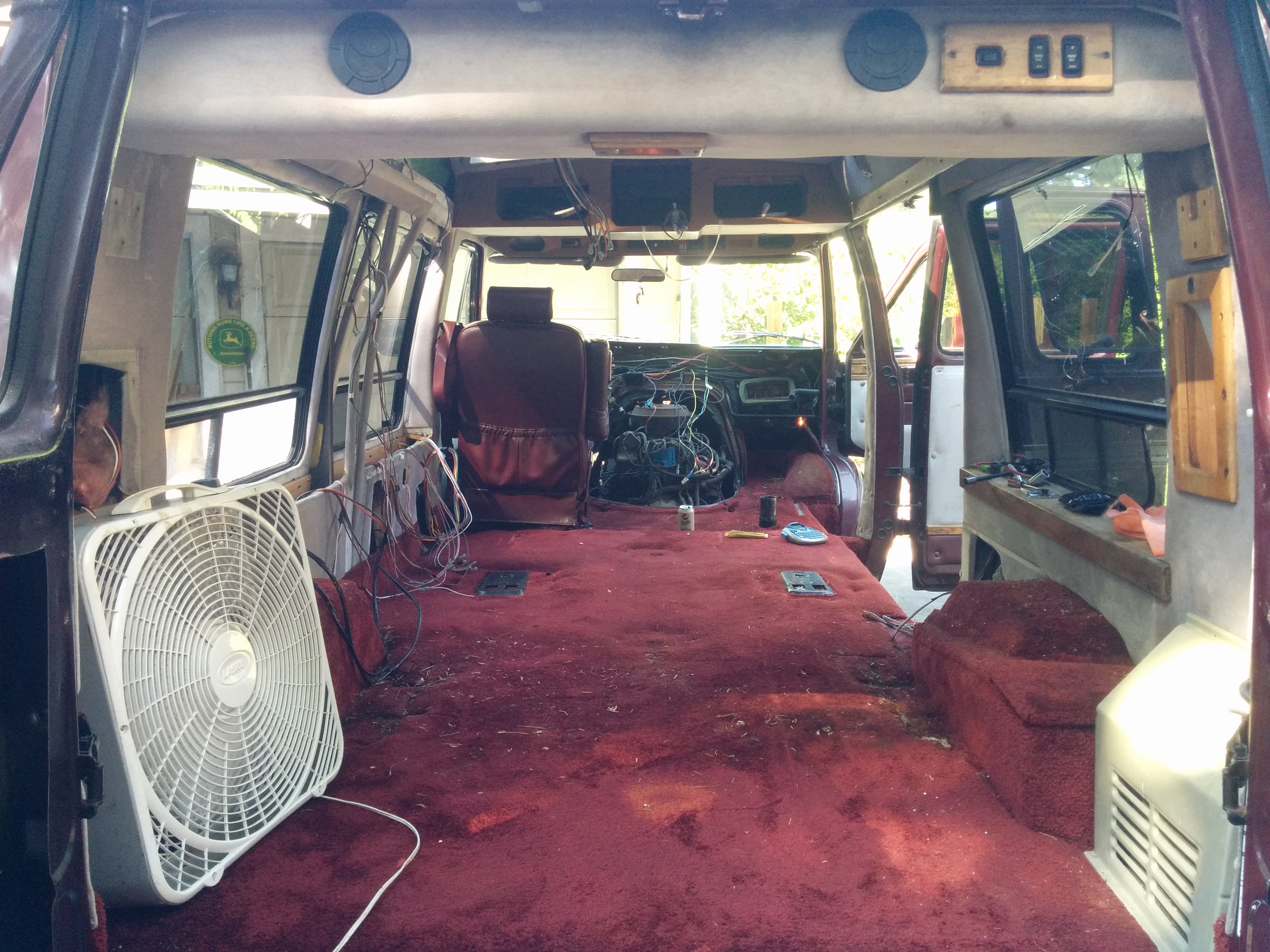 The van interior had been generously outfitted with 6+ speakers, numerous 12V outlets, headphone jacks connected to the rear cassette deck, small cabin lights, side rope lights, and just tons of aftermarket modifications in general.