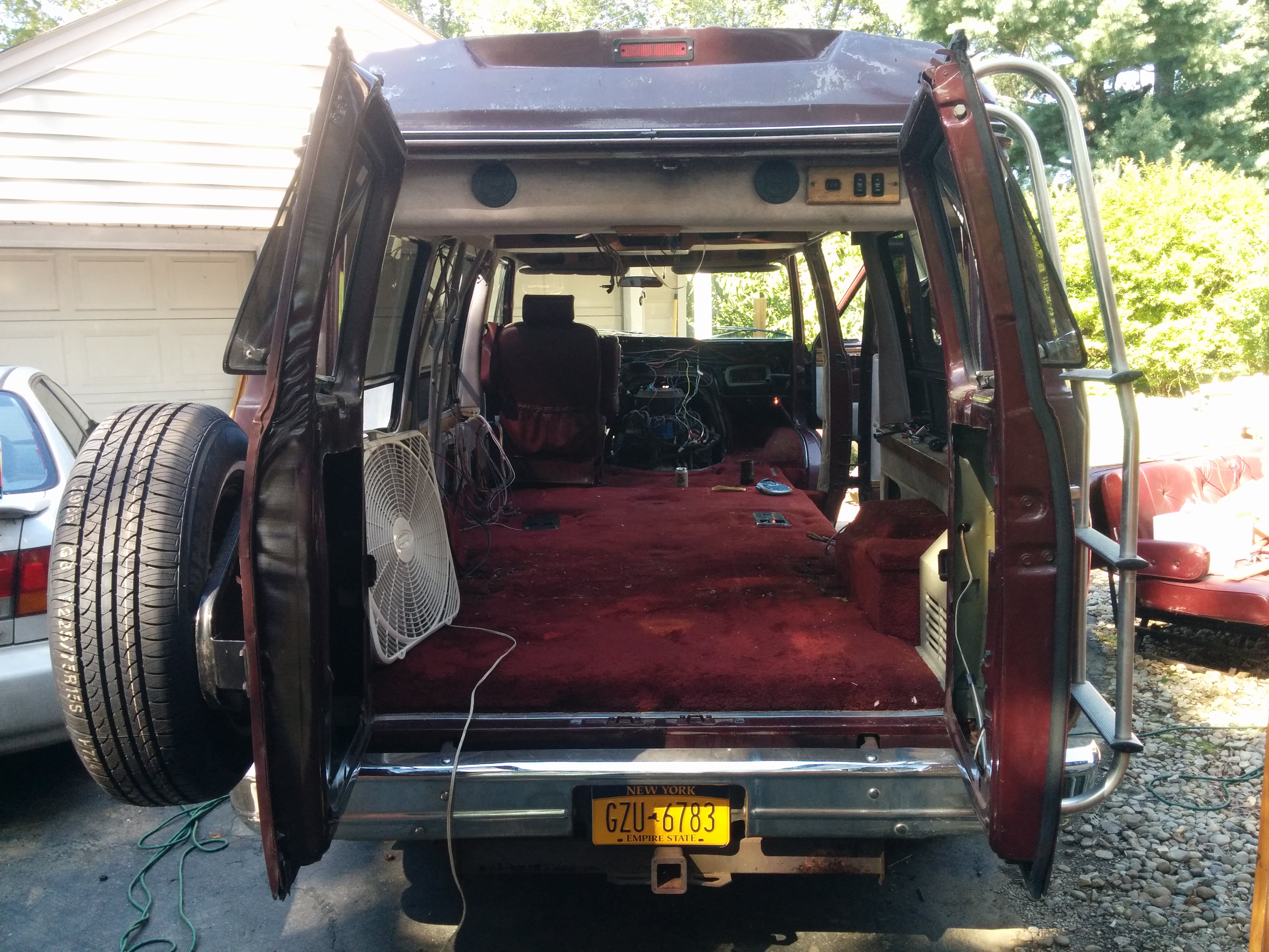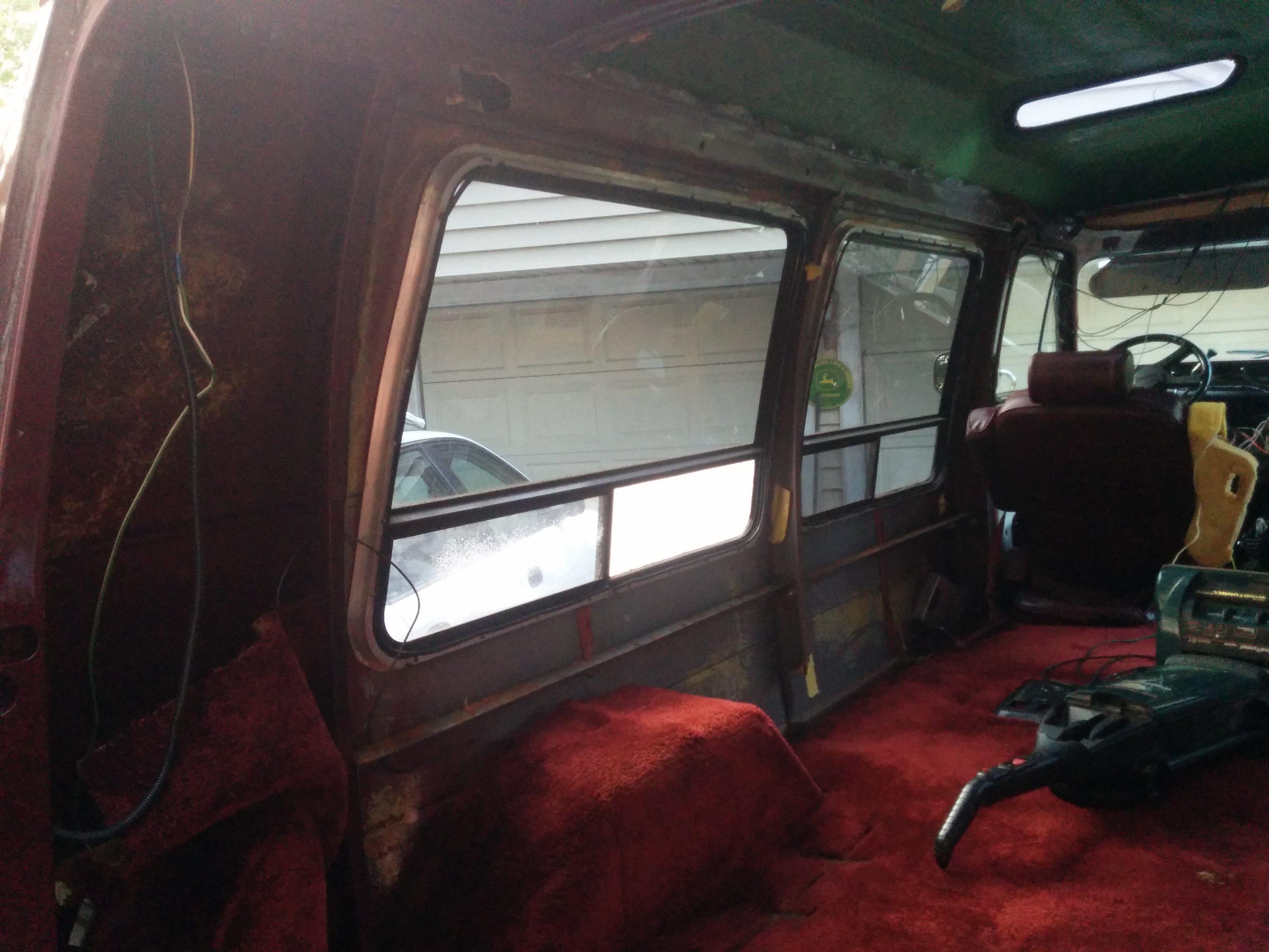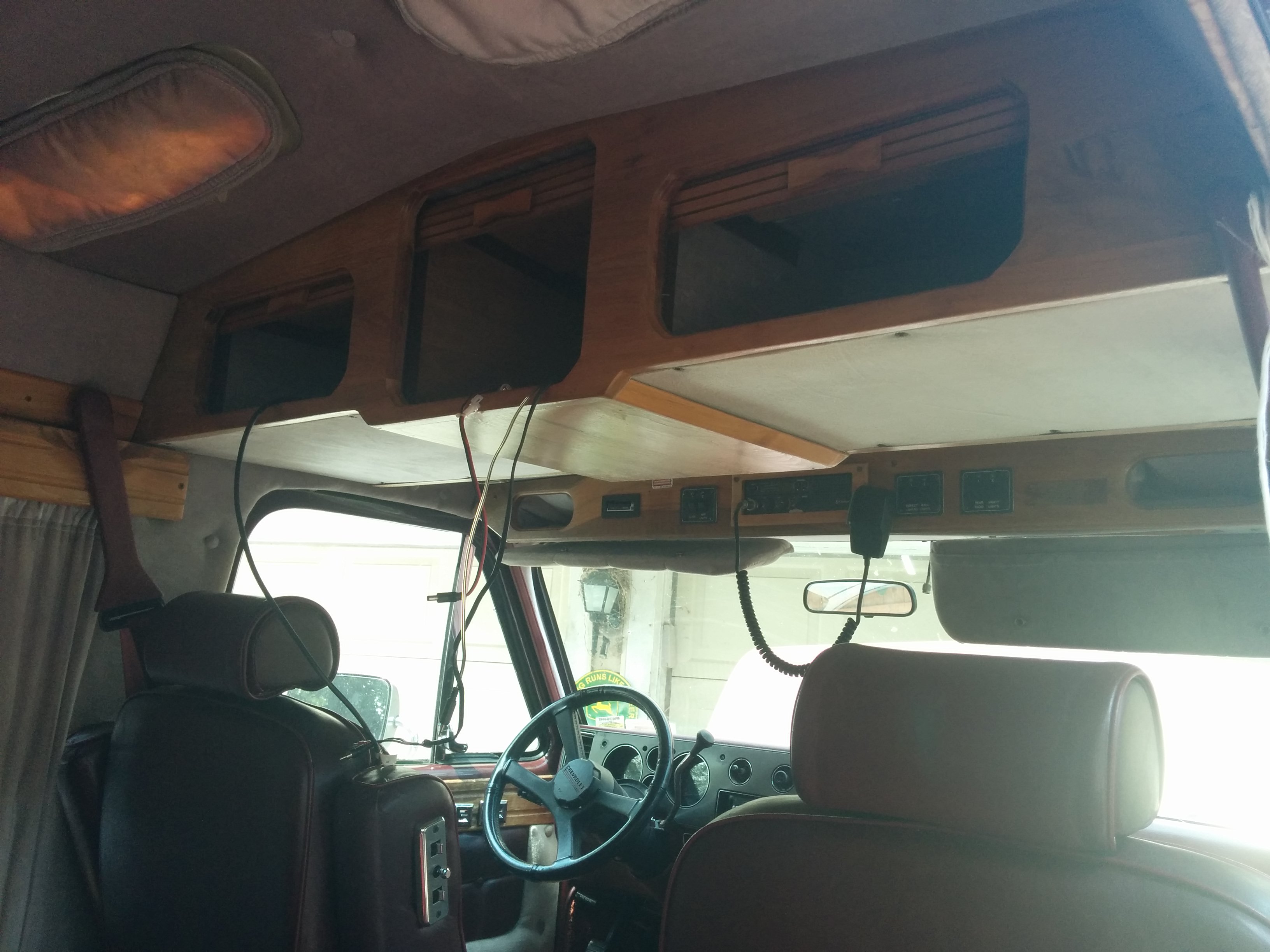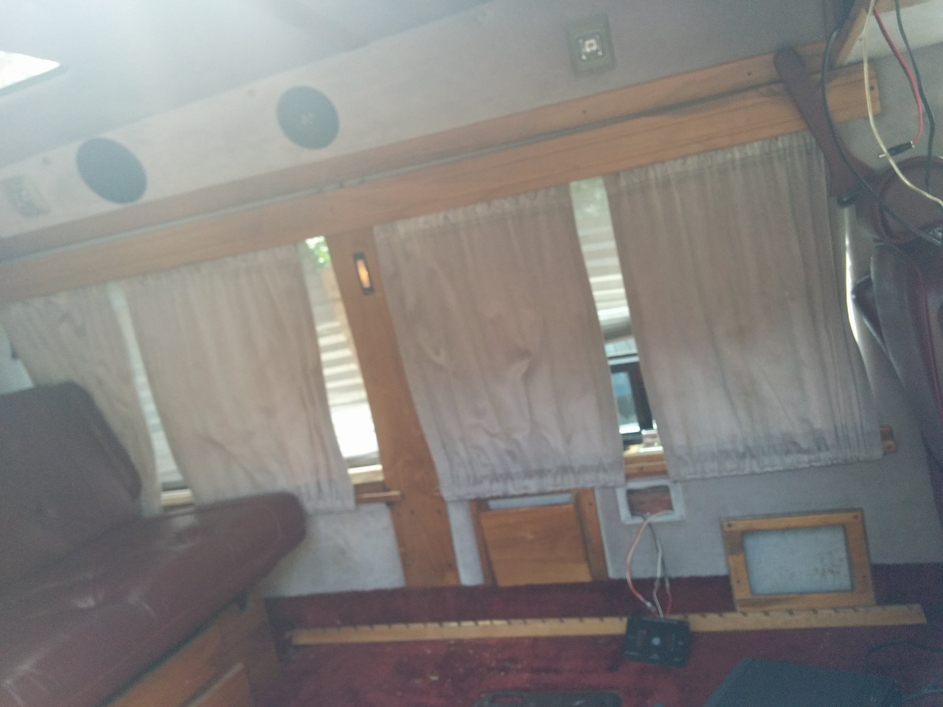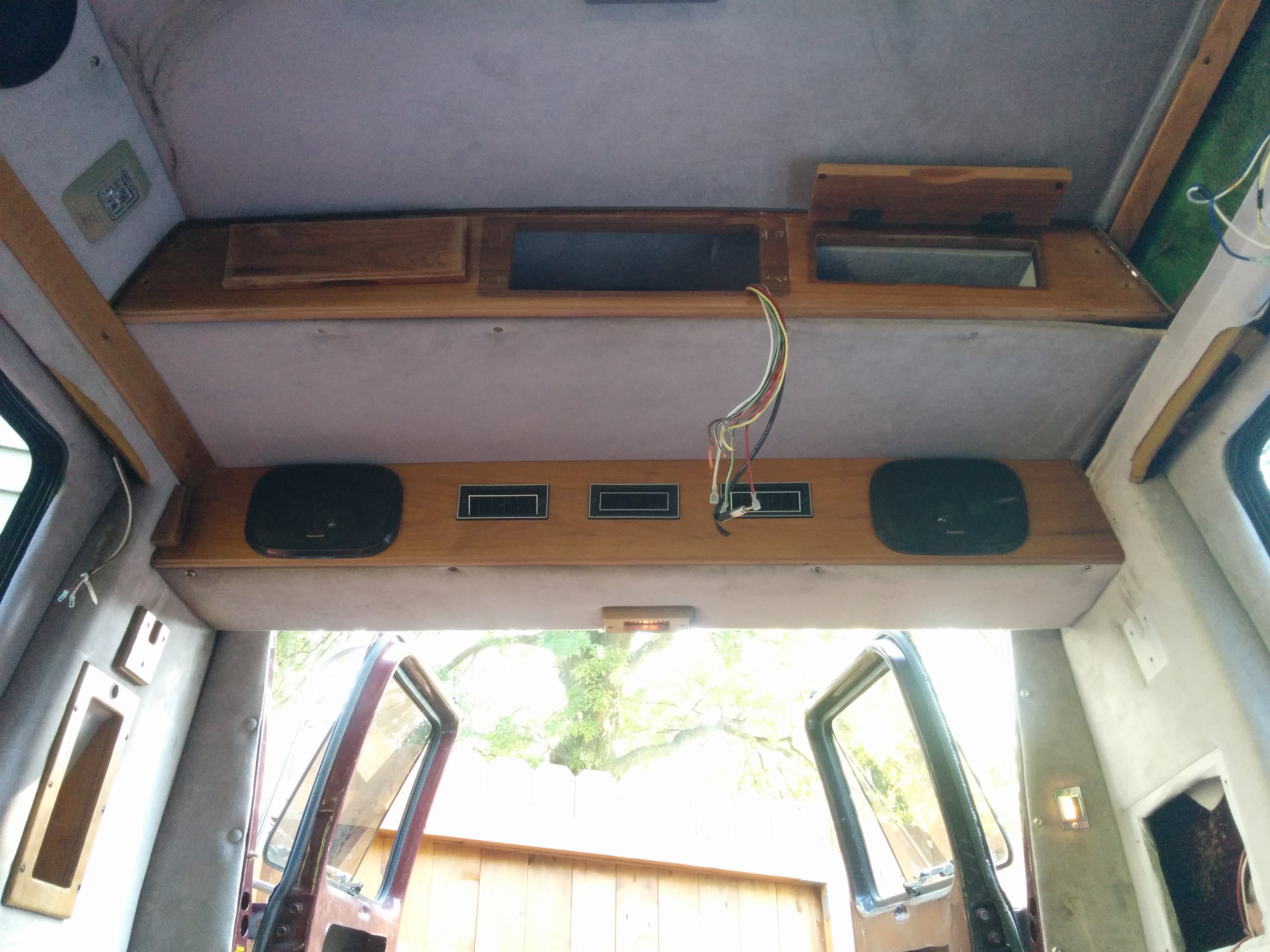 The van interior had been generously outfitted with 6+ speakers, numerous 12V outlets, headphone jacks connected to the rear cassette deck, small cabin lights, side rope lights, and just tons of aftermarket modifications in general.