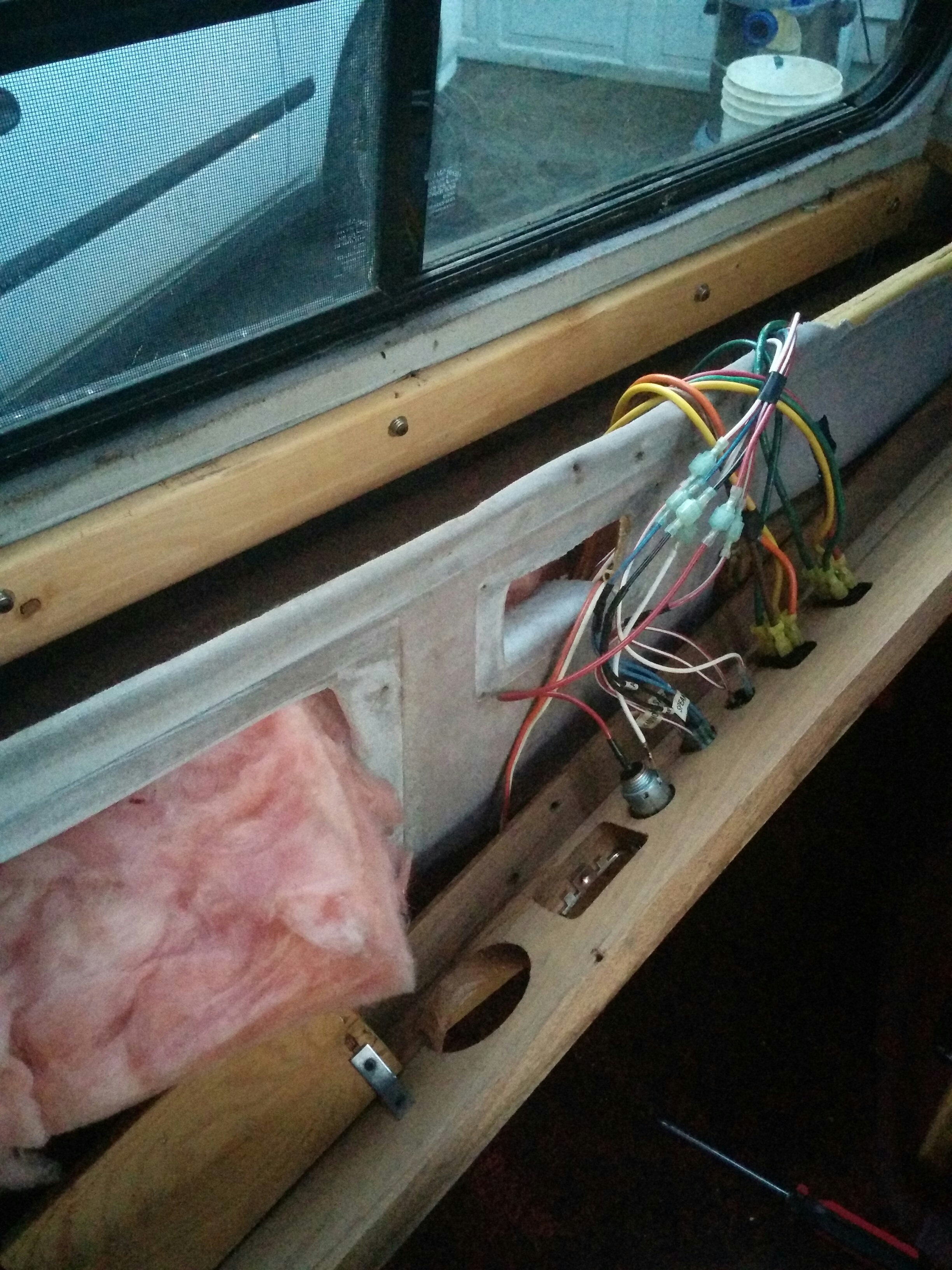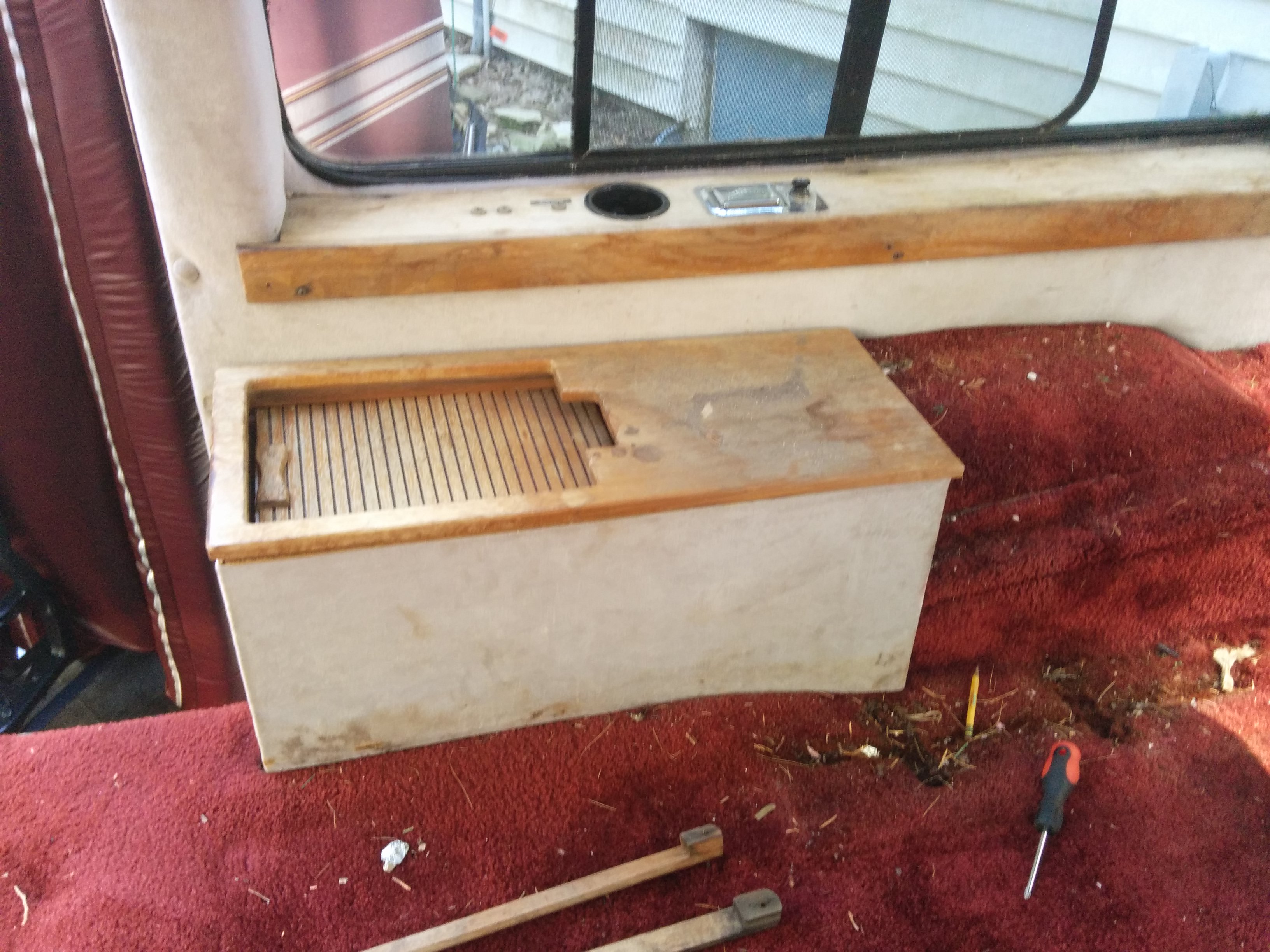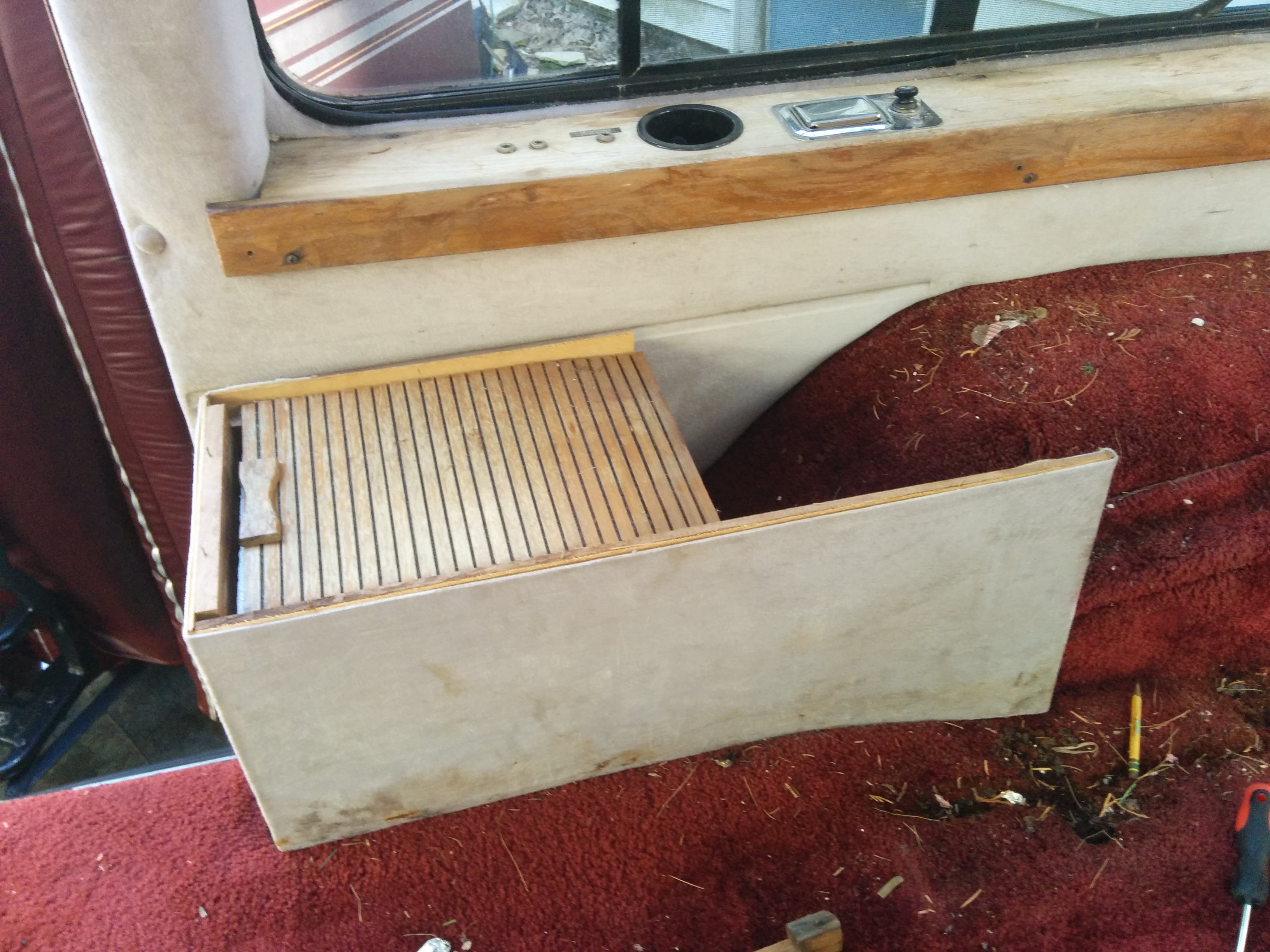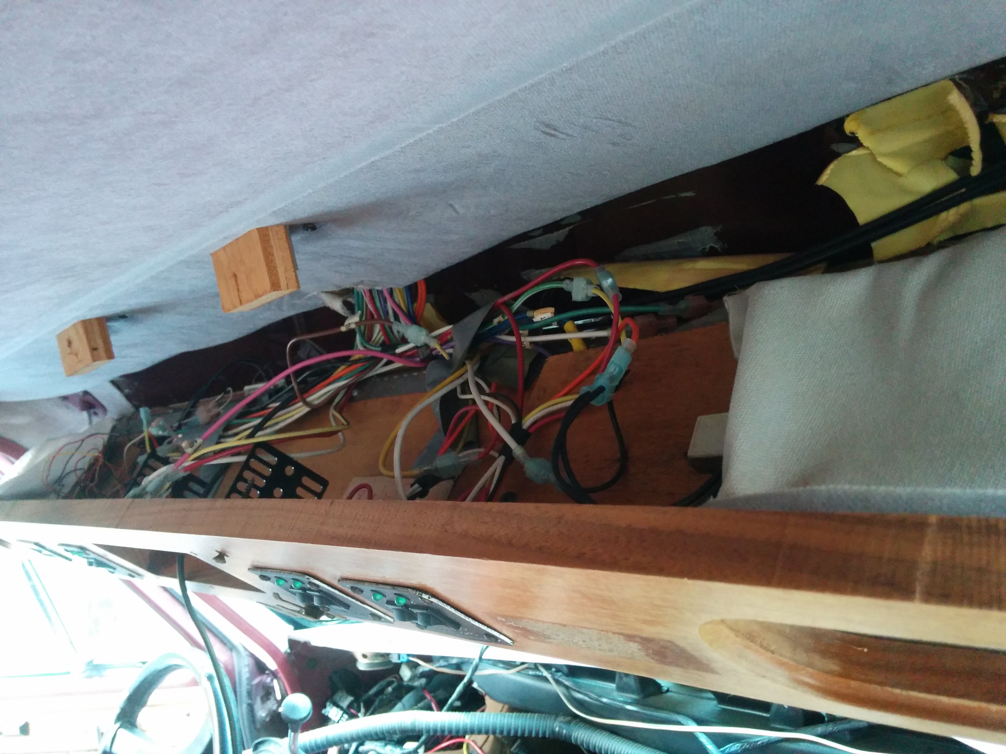 The front deck has all sorts of things. A clock, a CB radio, and switches for “map lights,” “indirect lighting,” “wall lights,” “vanity lights,” and “rear radio.” Some of these worked and some of them didn’t; obviously, even fewer of them were of any use now that I’d removed indirect/wall/vanity lights and the rear radio. Still, I honestly would have been happy to just leave this area as is, but the way the tv hutch and everything else was attached made this very difficult.