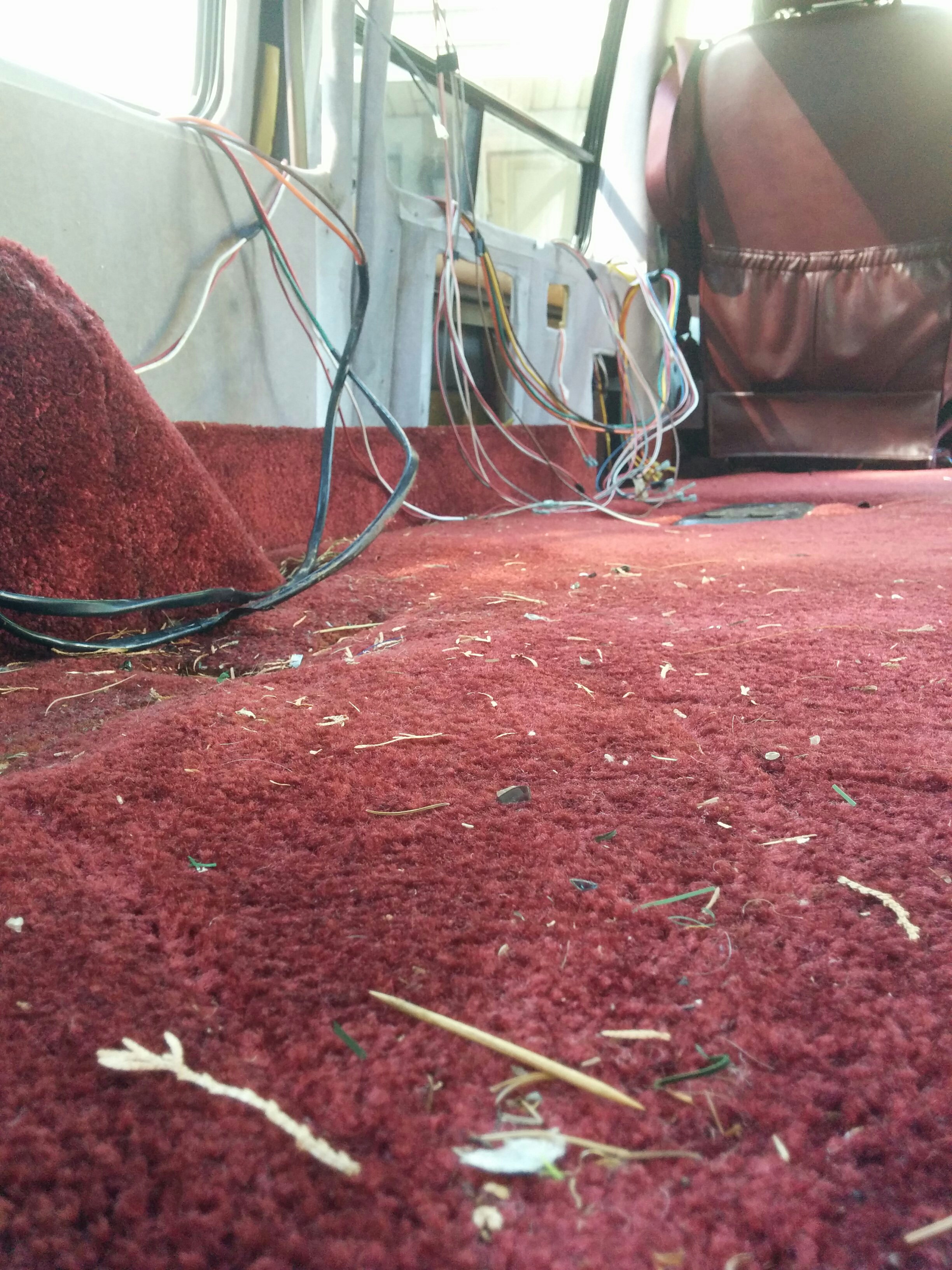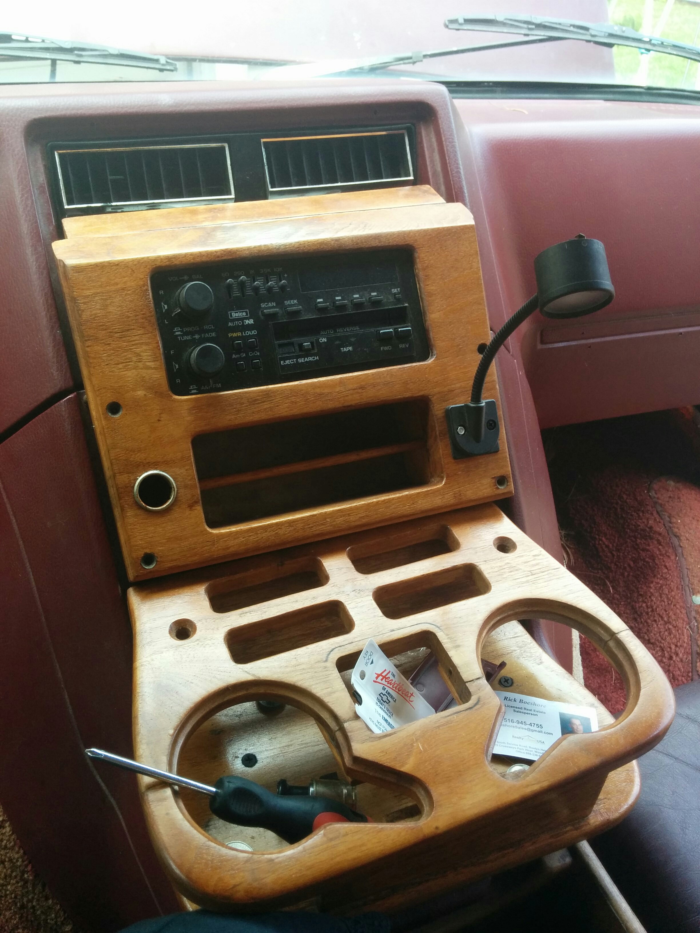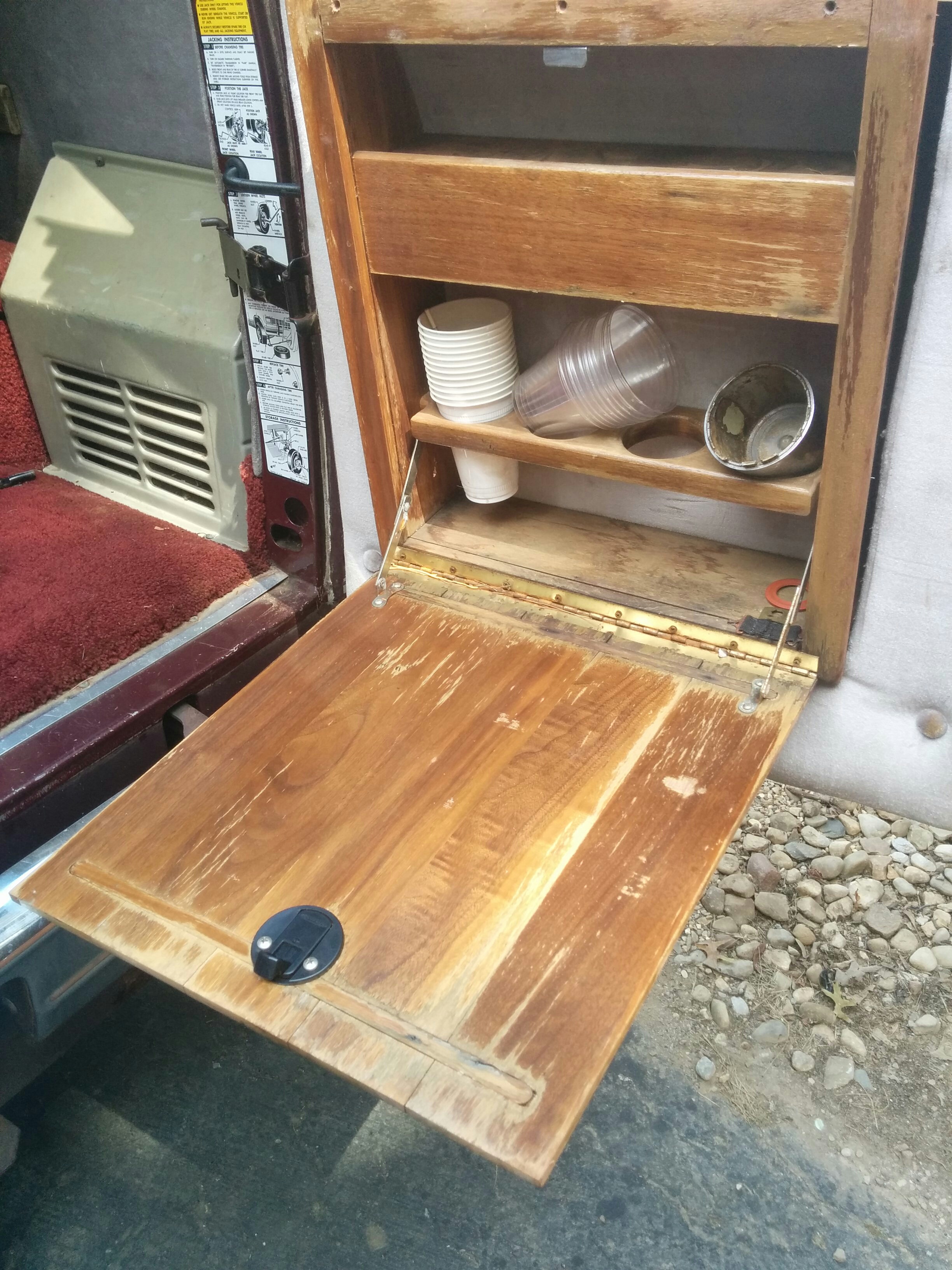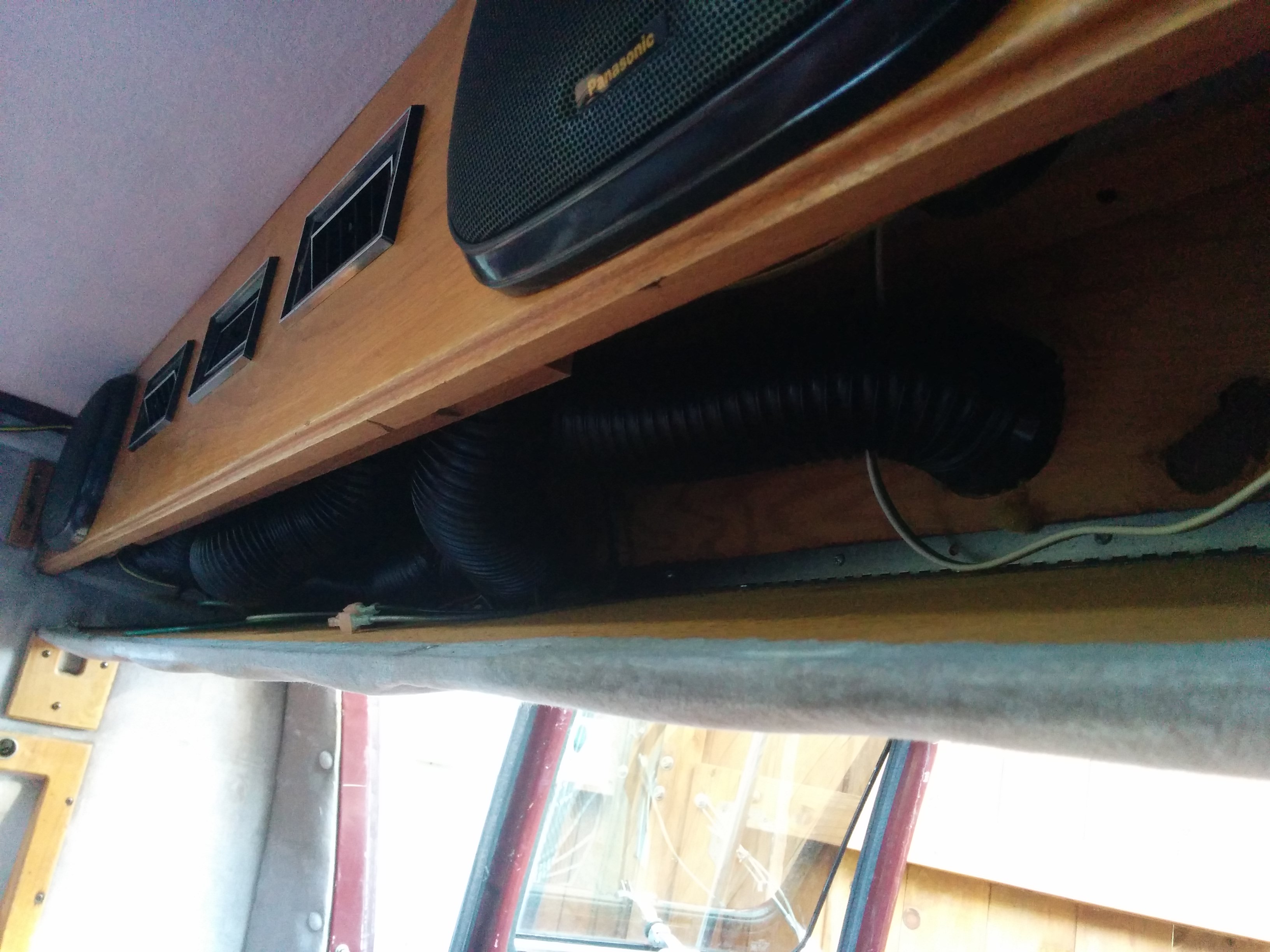 The front deck has all sorts of things. A clock, a CB radio, and switches for “map lights,” “indirect lighting,” “wall lights,” “vanity lights,” and “rear radio.” Some of these worked and some of them didn’t; obviously, even fewer of them were of any use now that I’d removed indirect/wall/vanity lights and the rear radio. Still, I honestly would have been happy to just leave this area as is, but the way the tv hutch and everything else was attached made this very difficult.