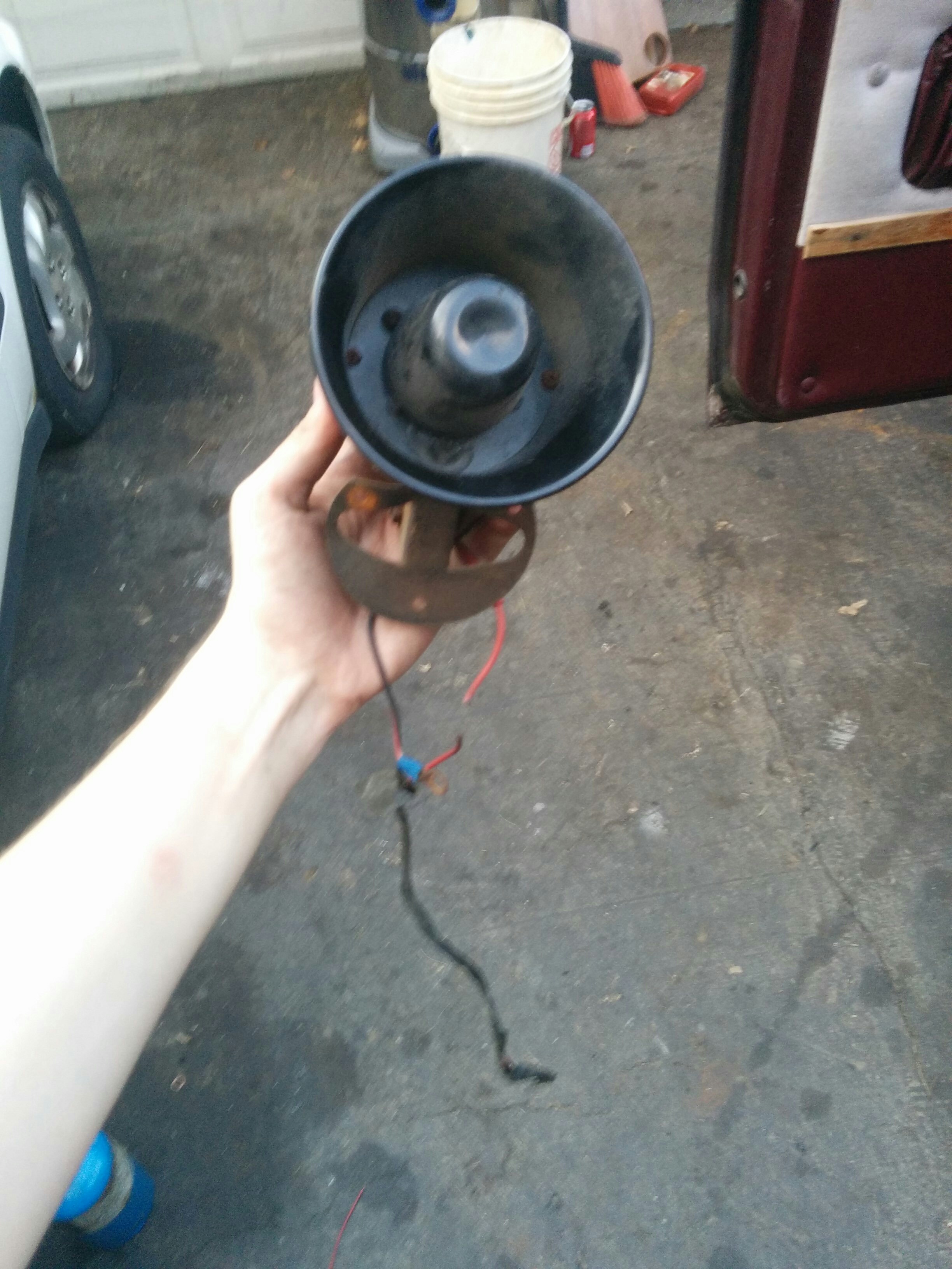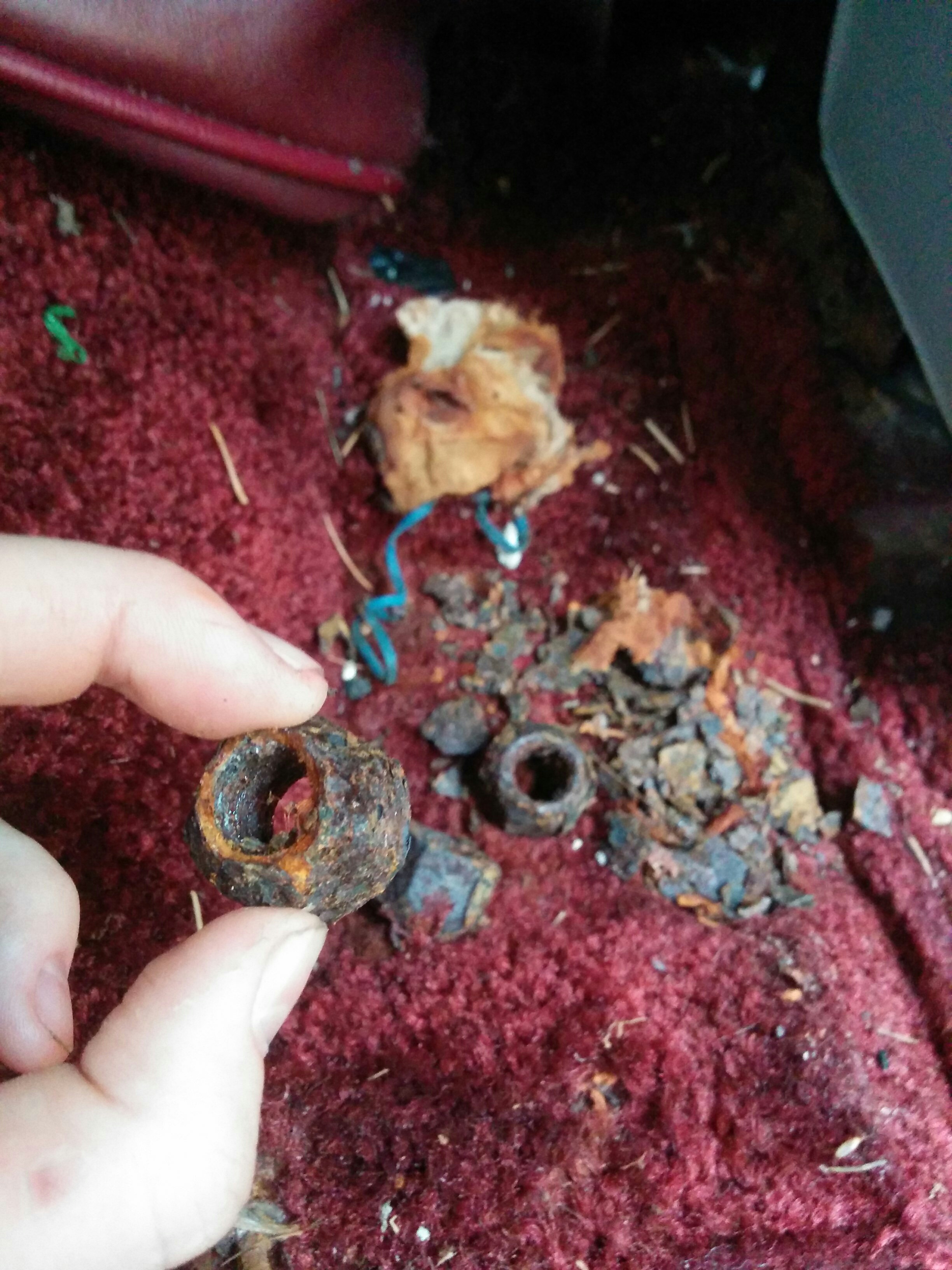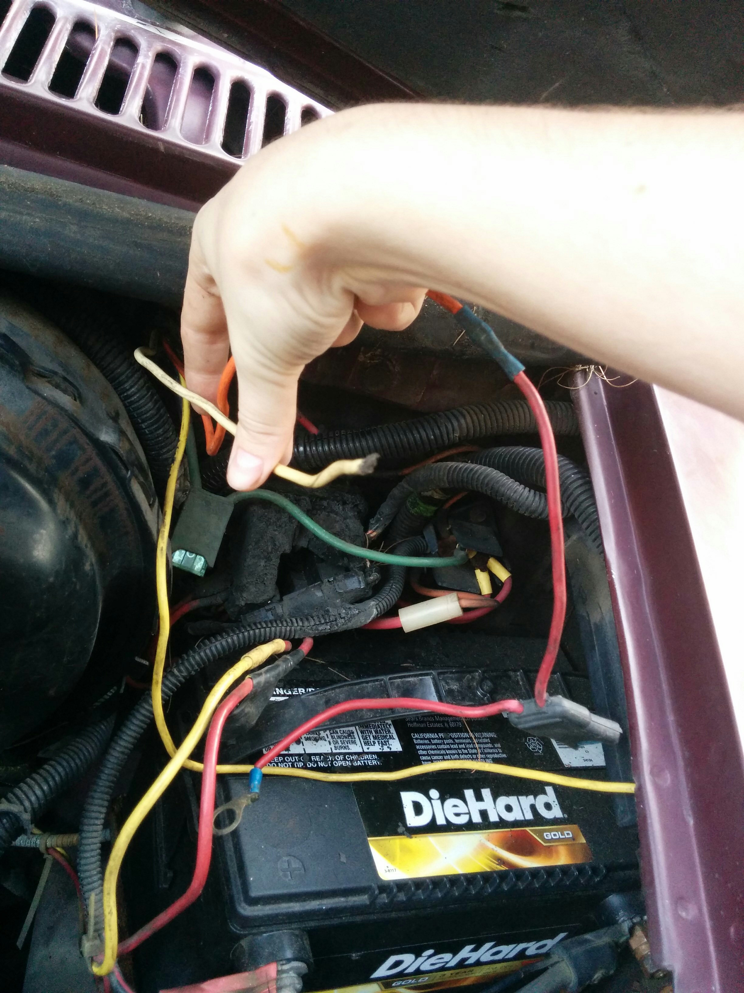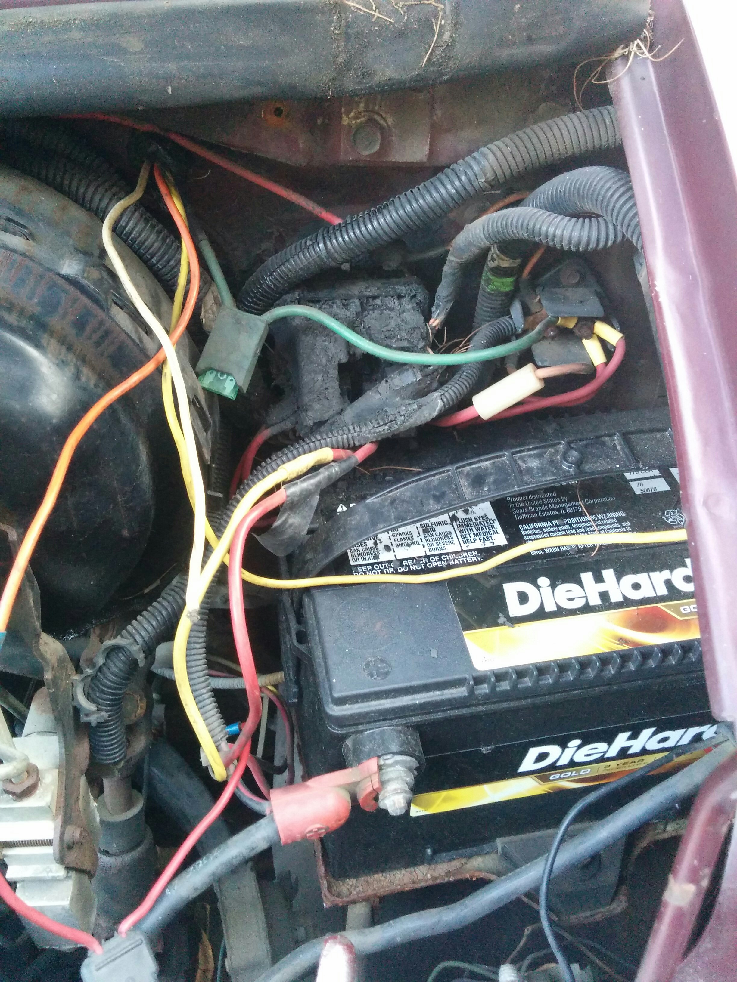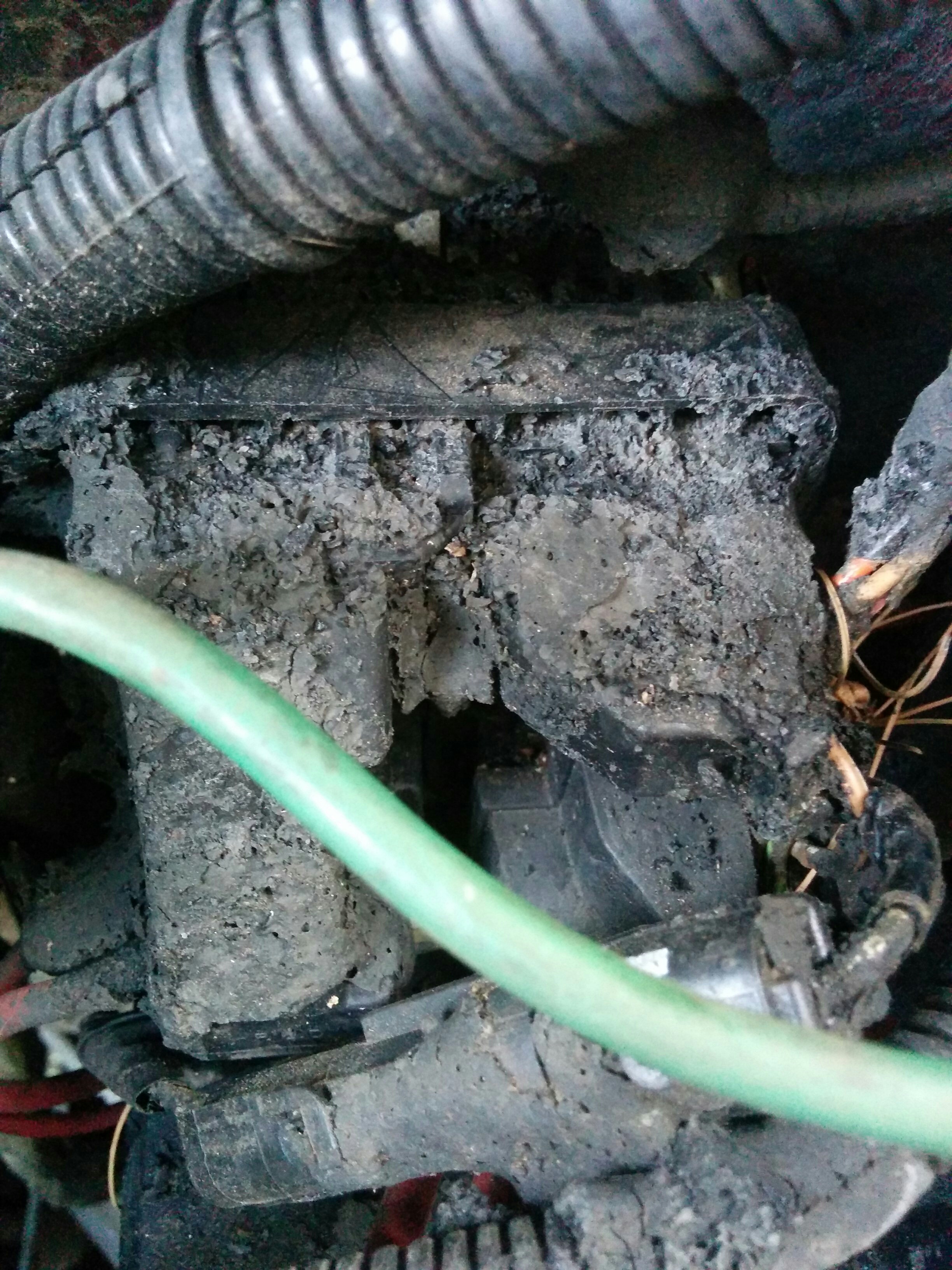 A quick peek in the battery area of the engine bay revealed a few more enigmas. Some of it was disconnected and not attached to anything, some of it was…melted!? This speaker thing wasn’t connected to anything iirc. Some sort of aftermarket security system, maybe?