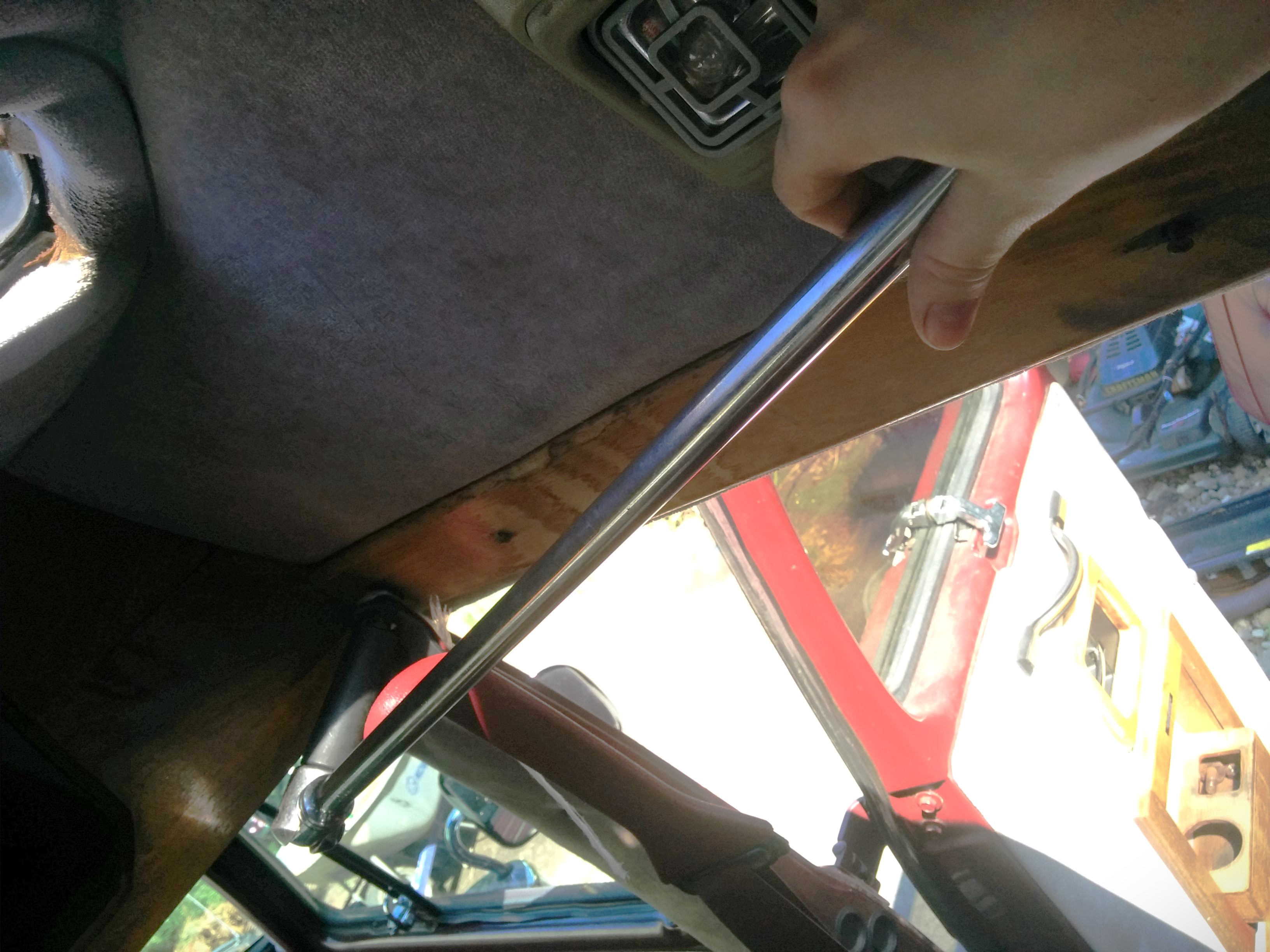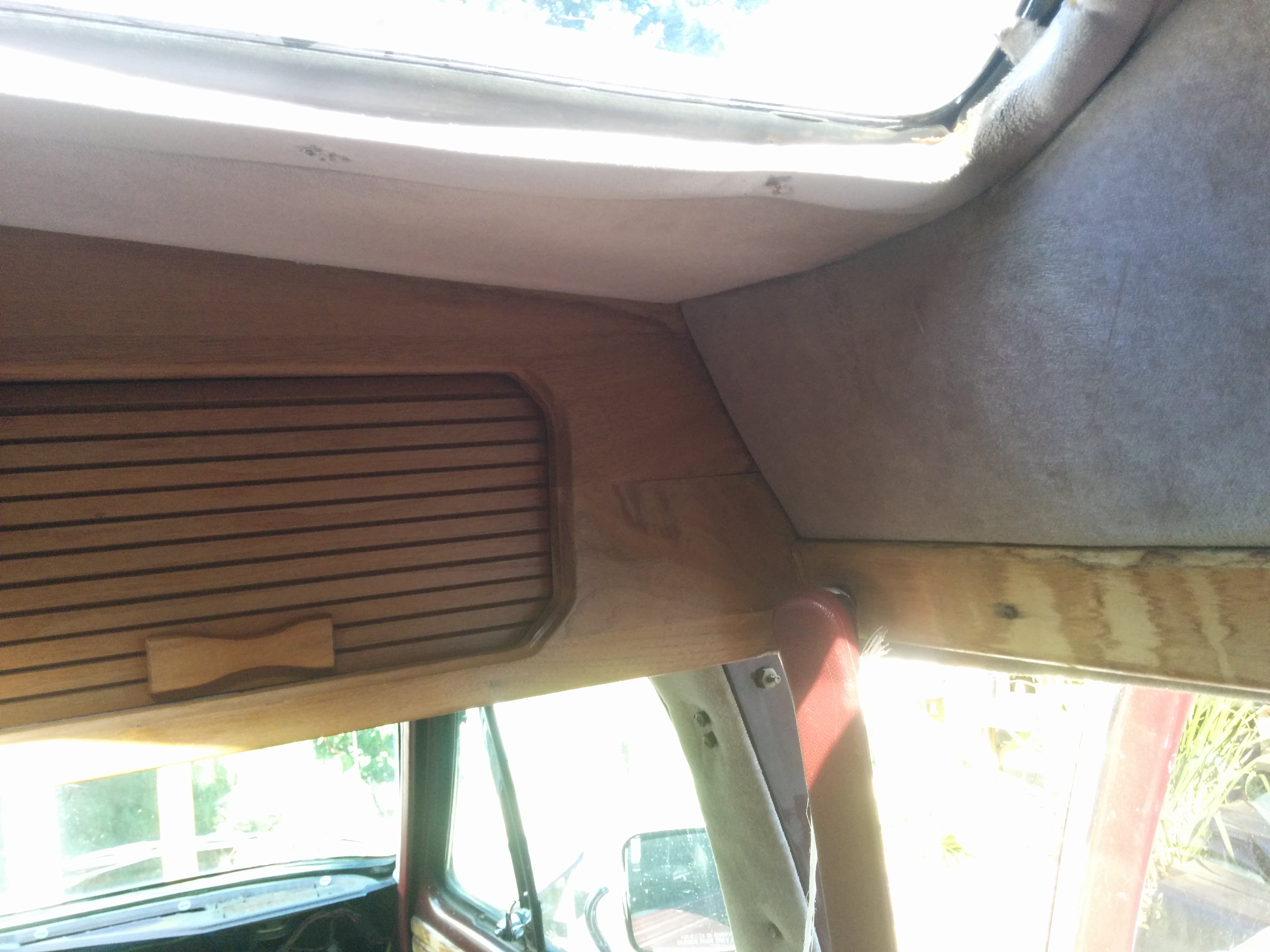 Here you can see the original roof of the van! They chopped most of it off and replaced it, but this stub remained. The random chunk of plywood underneath gave the “lower shelf” something to attach to.