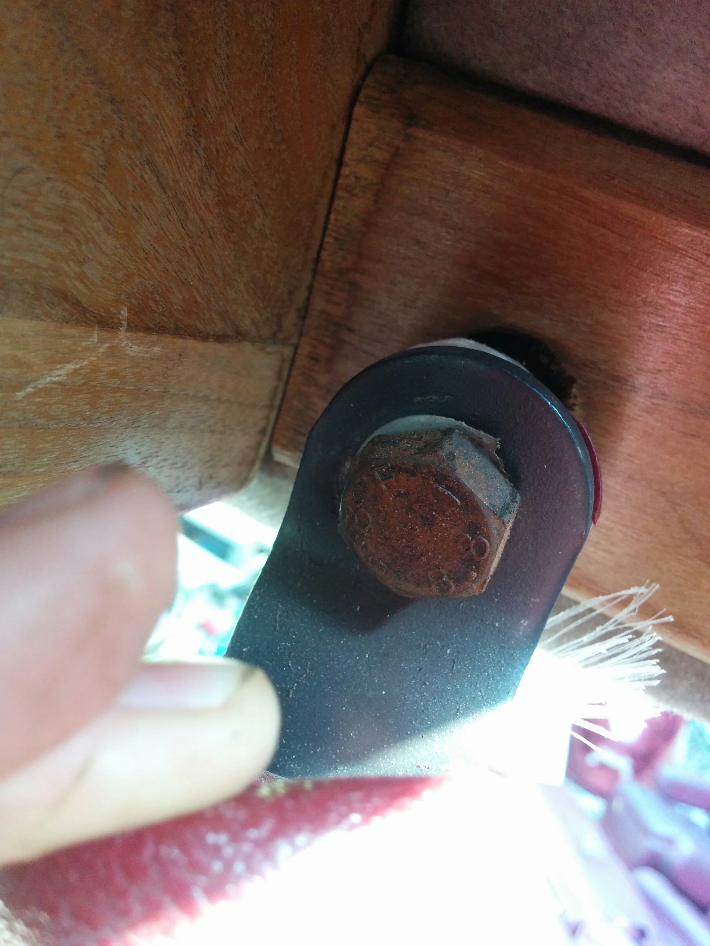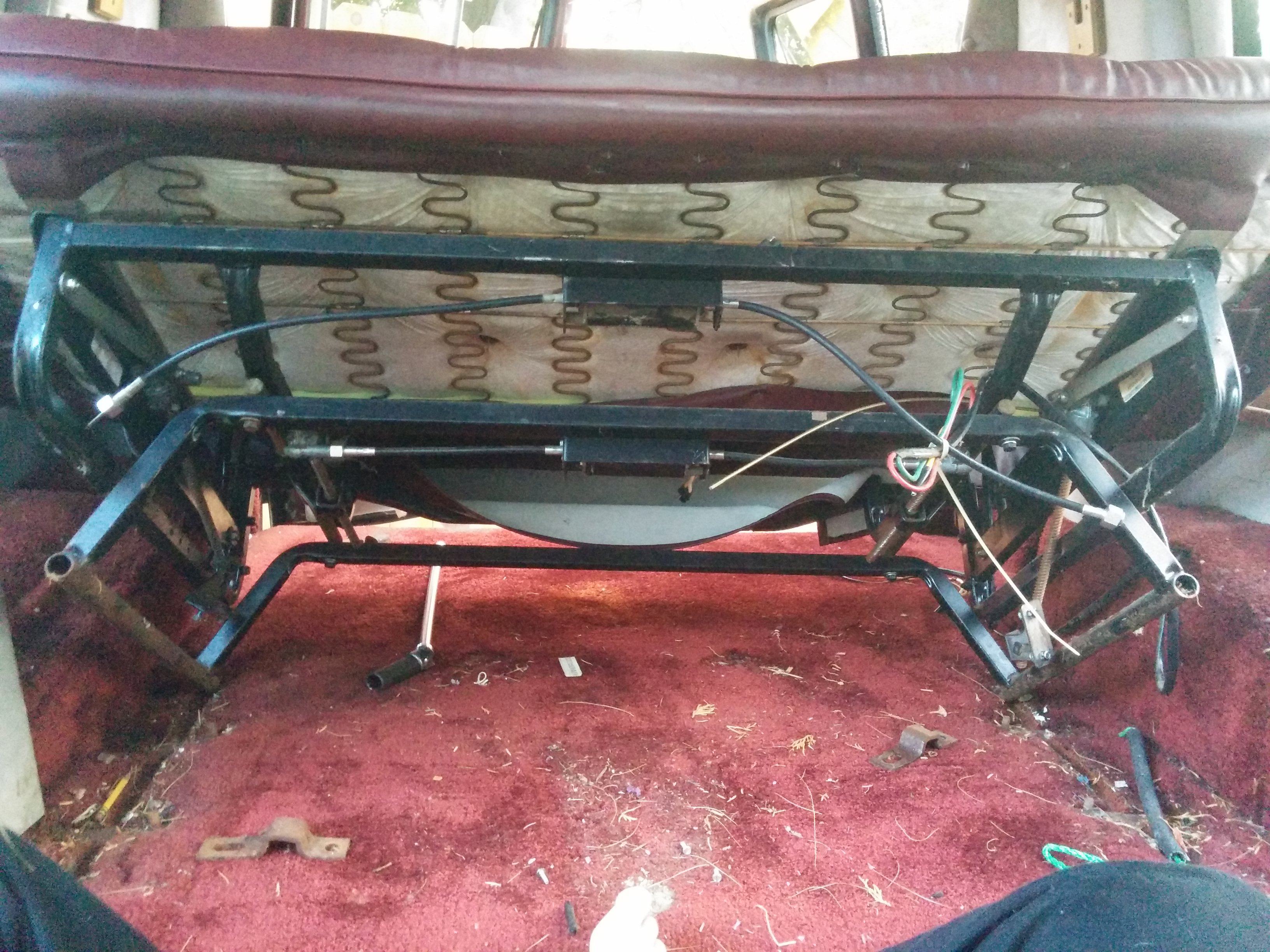 The couch was held down by multiple bolts passing through the carpet to the underside of the van. Half went up and half went down. I was able to get some loose with a very long ratchet but had to call in a Garrett assist to figure out how to free the rest (which turned out to be quite stuck).