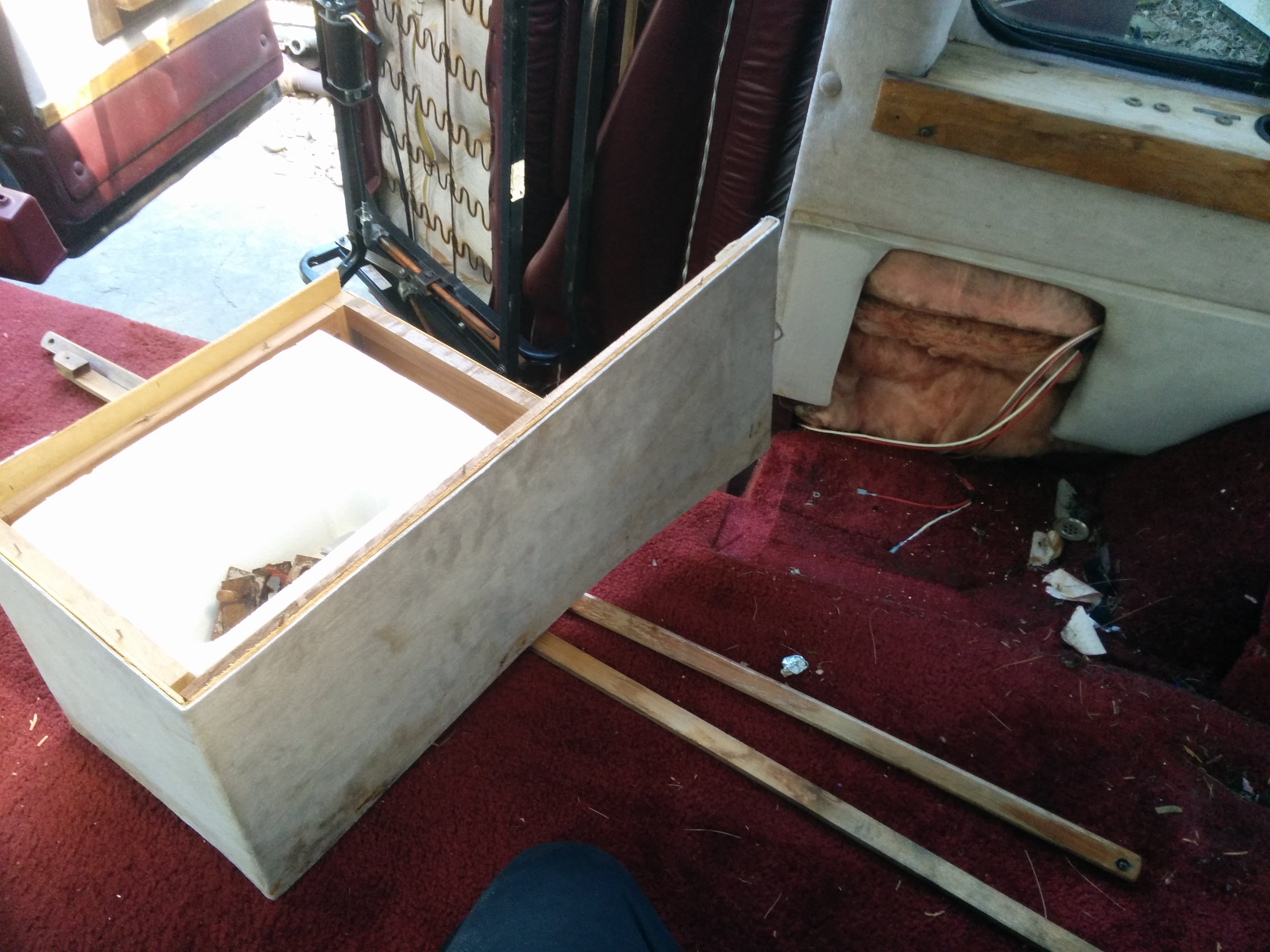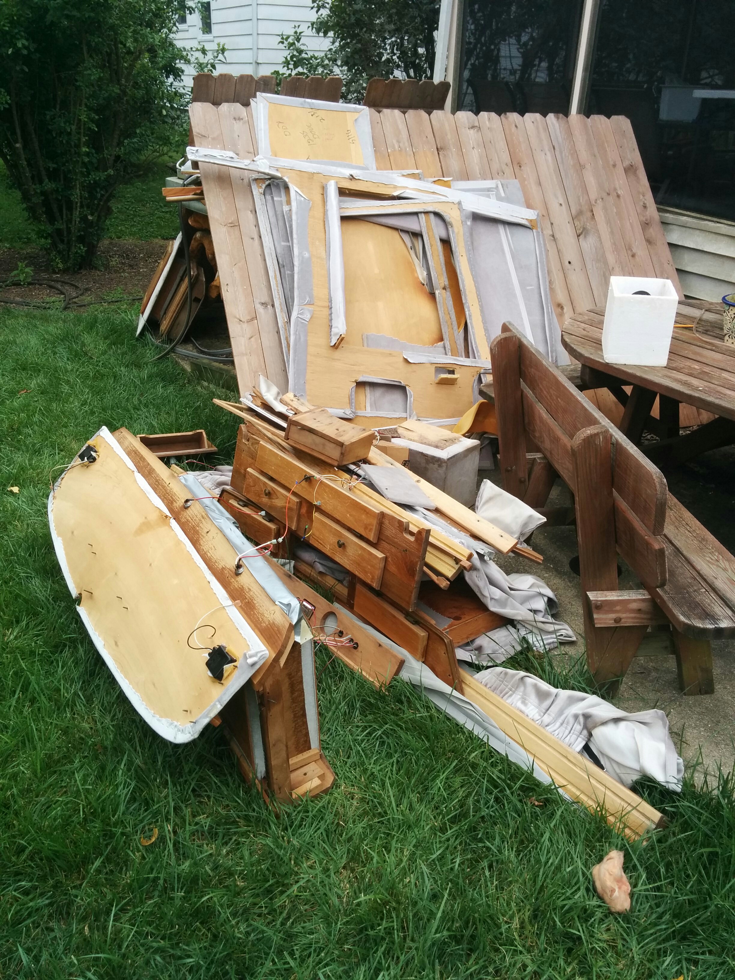 The next target was the couch. It had a power button that was supposed to transform it between couch-mode and bed-mode, but it didn’t work. I was already leaning towards removing it completely, but the first order of business was to get underneath and have a look at things by removing the wood drawers.