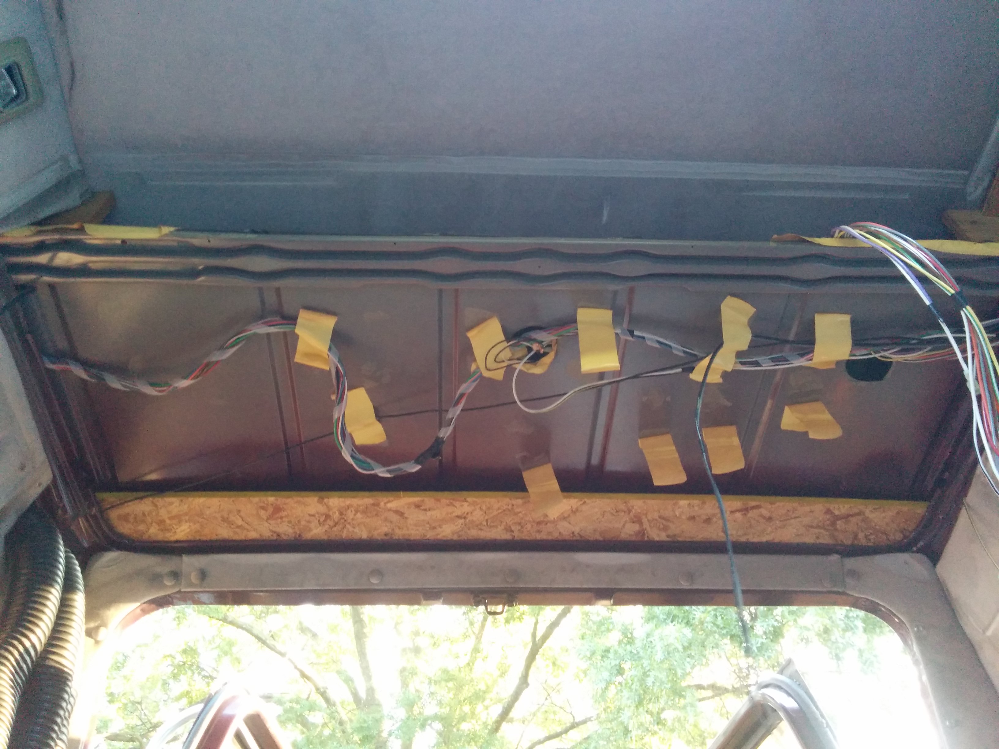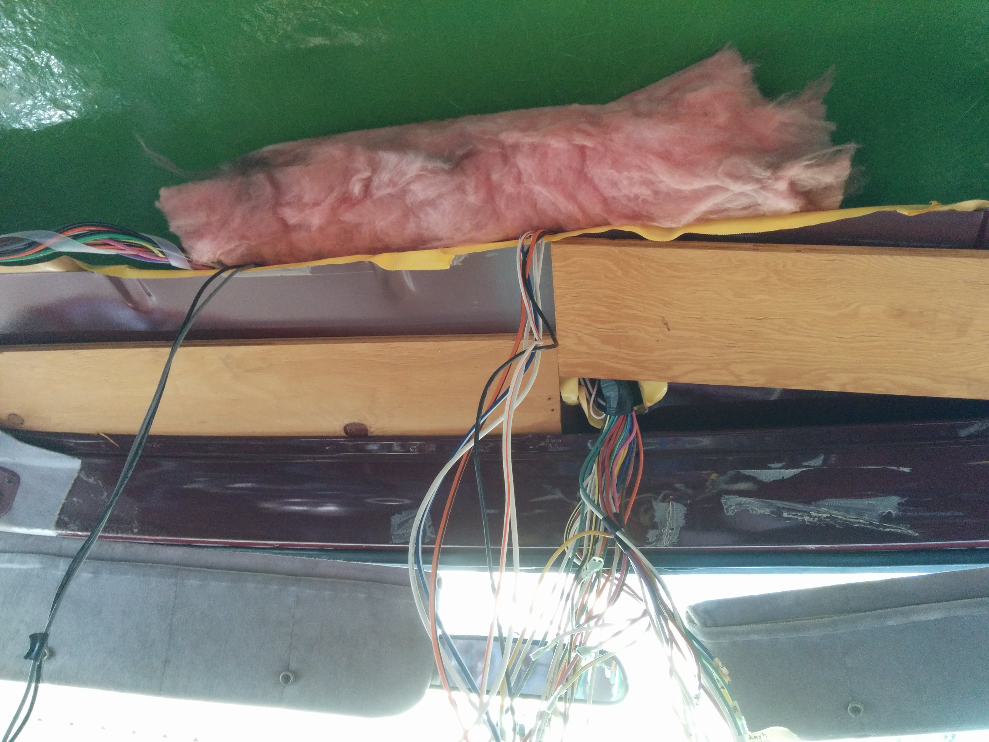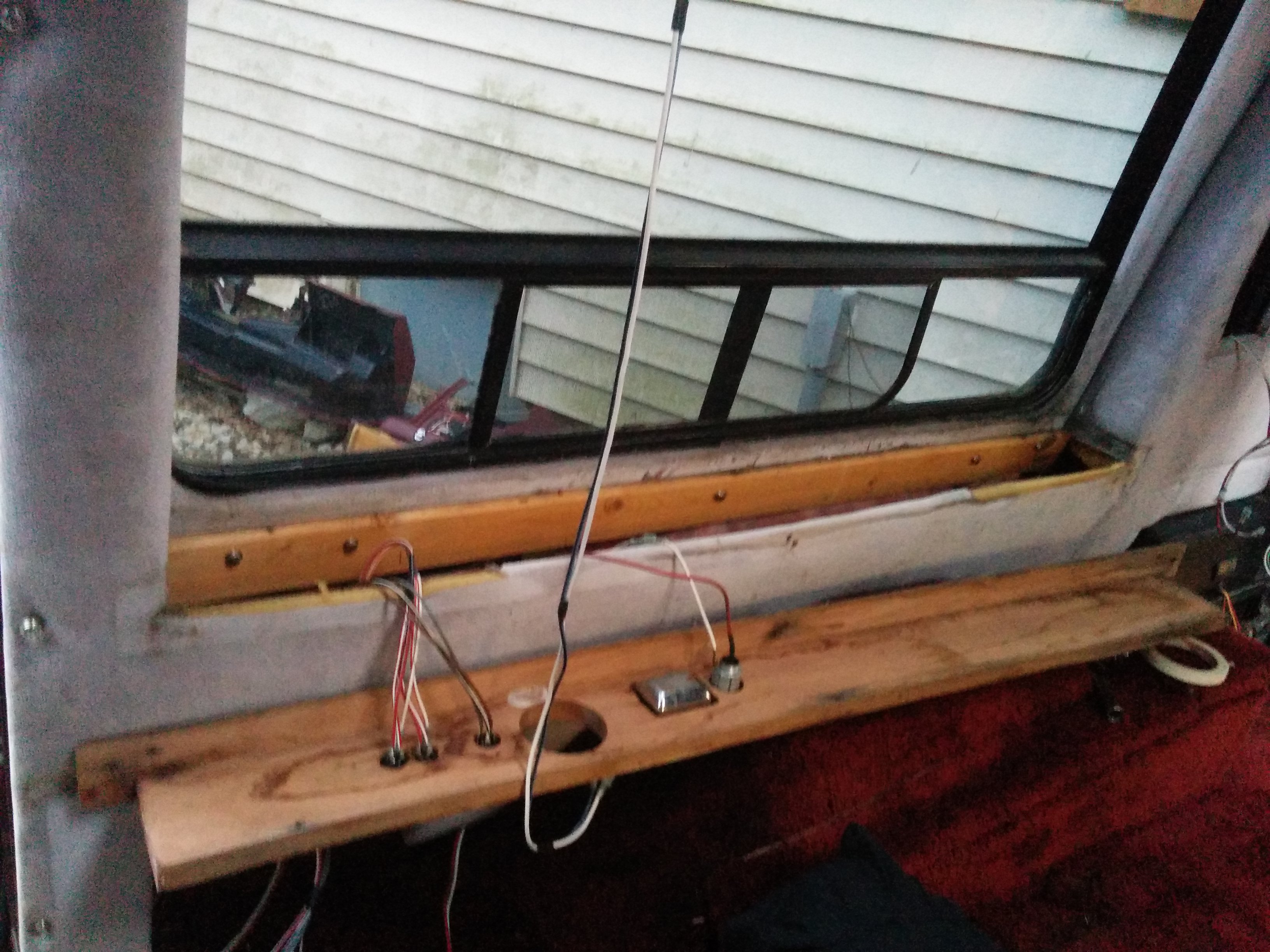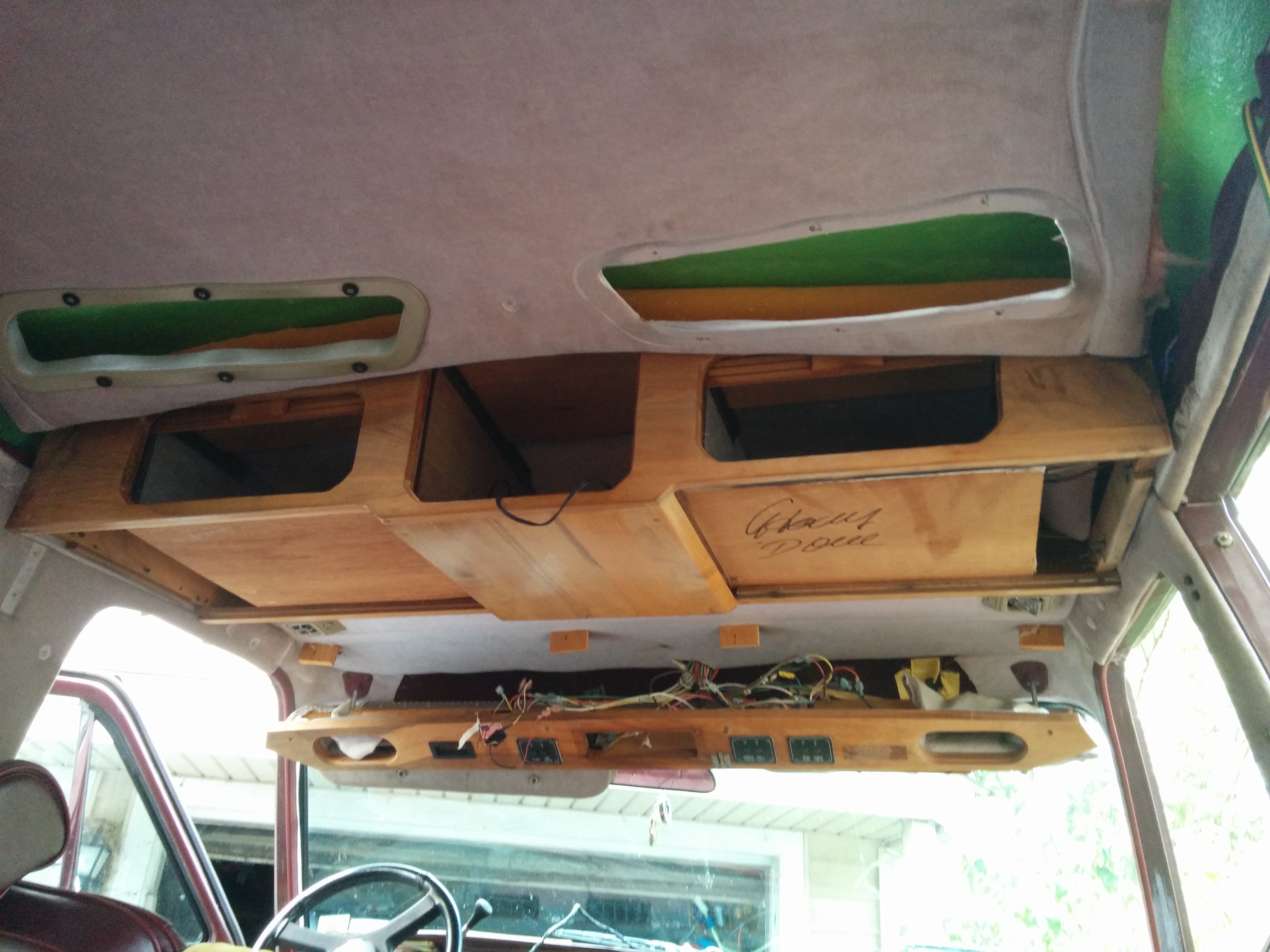 Another chunk of original van roof formed a shelf in the front, through which a hole had been drilled permitting cable access to the front deck.