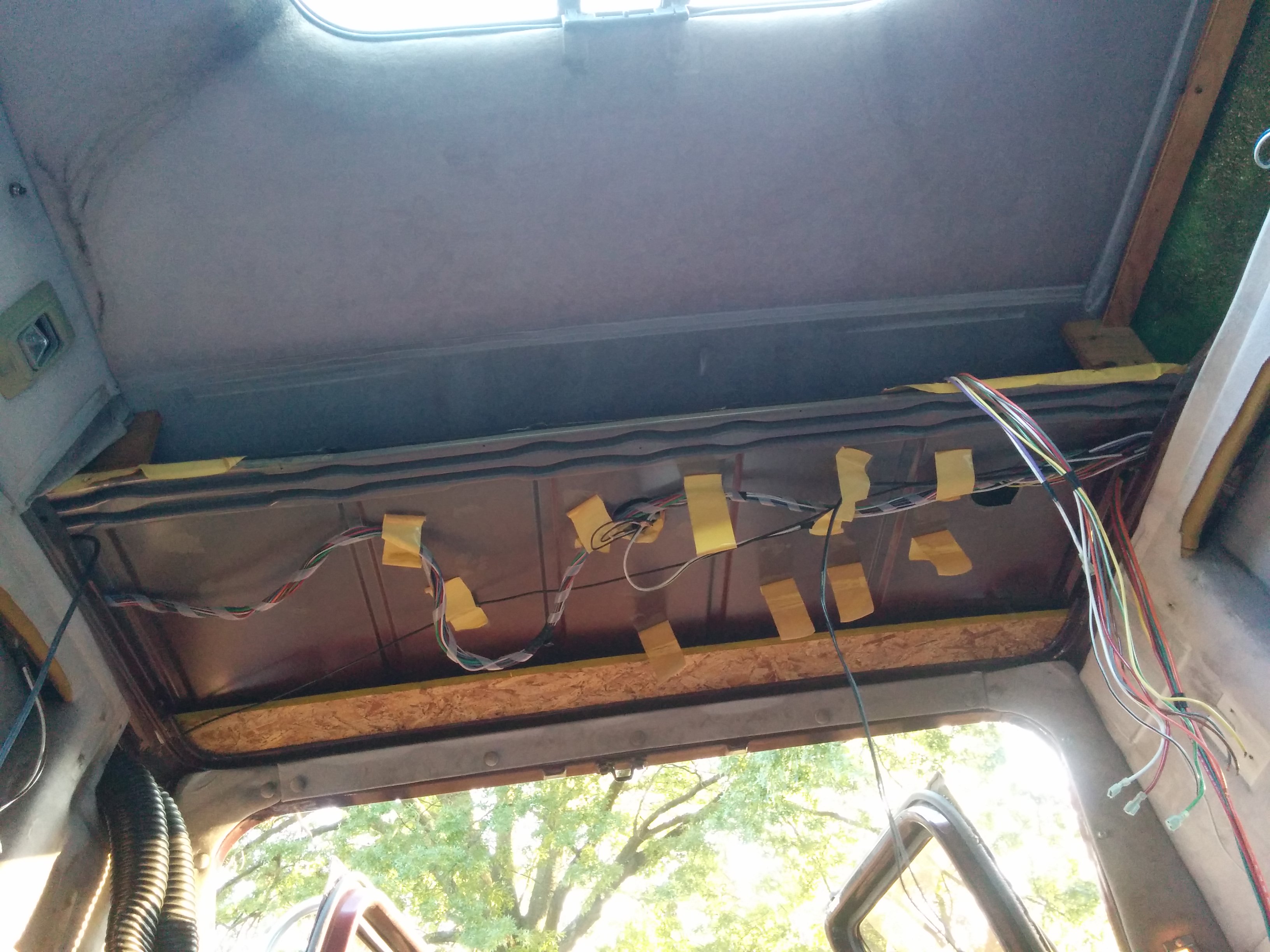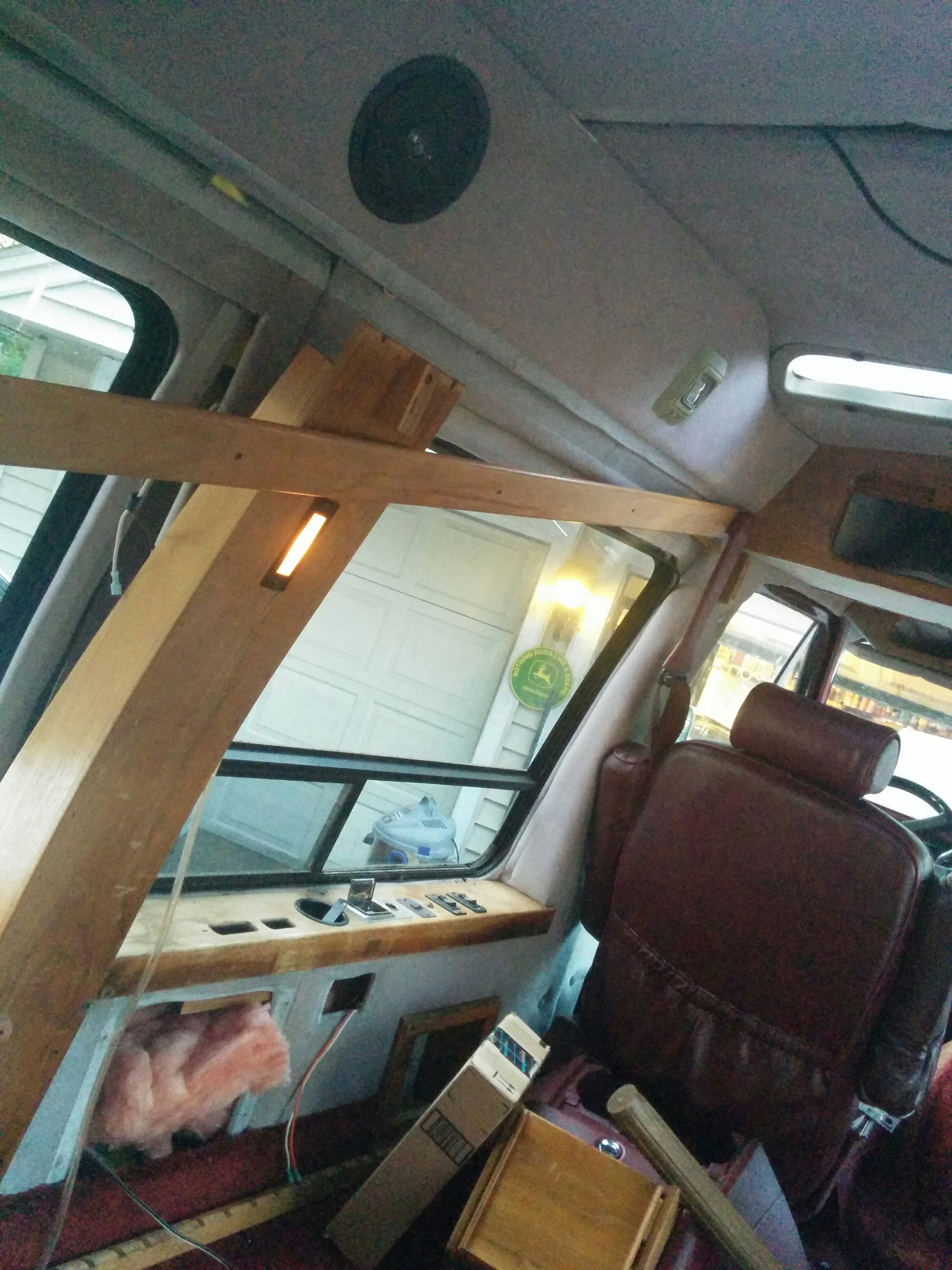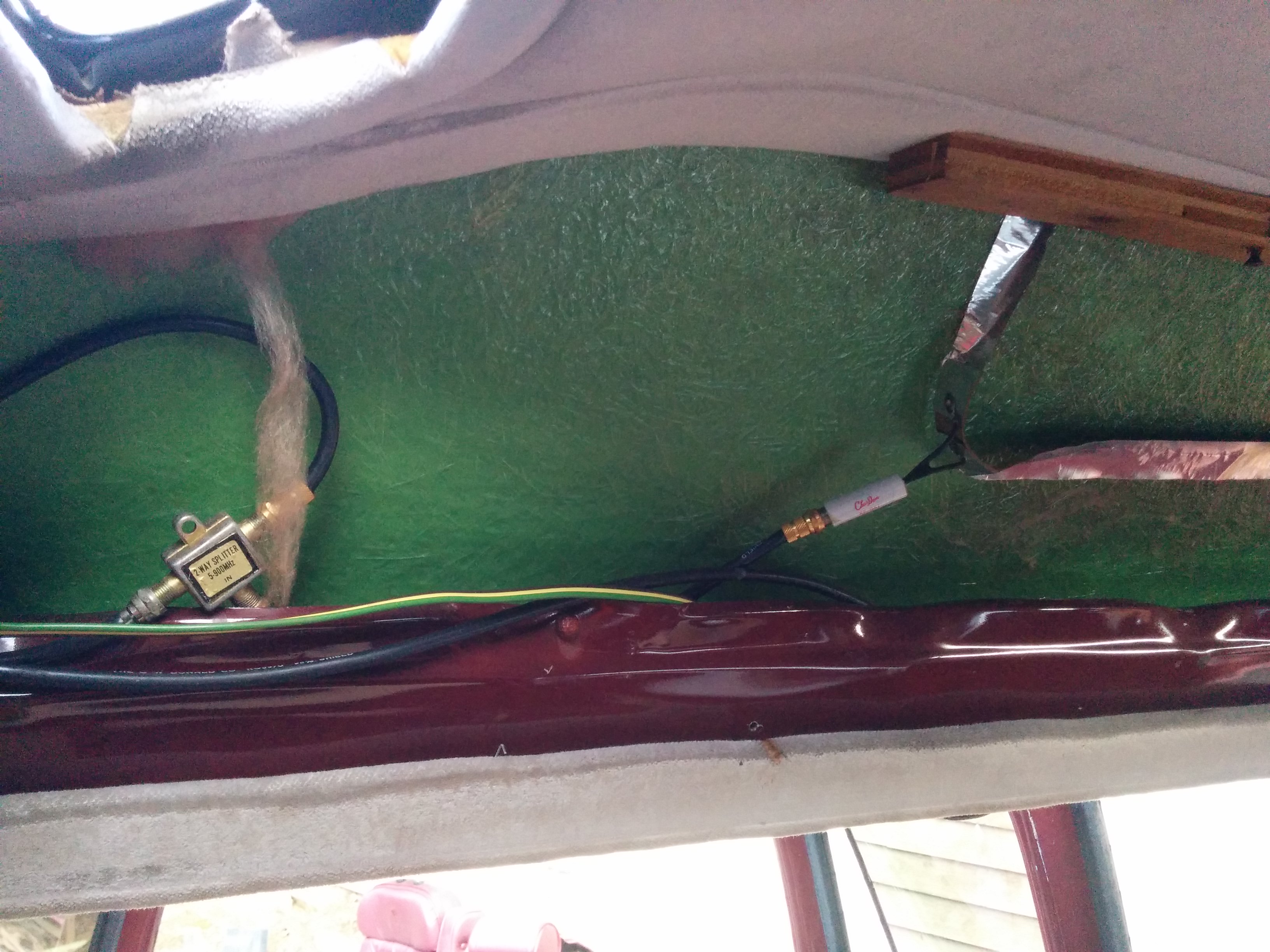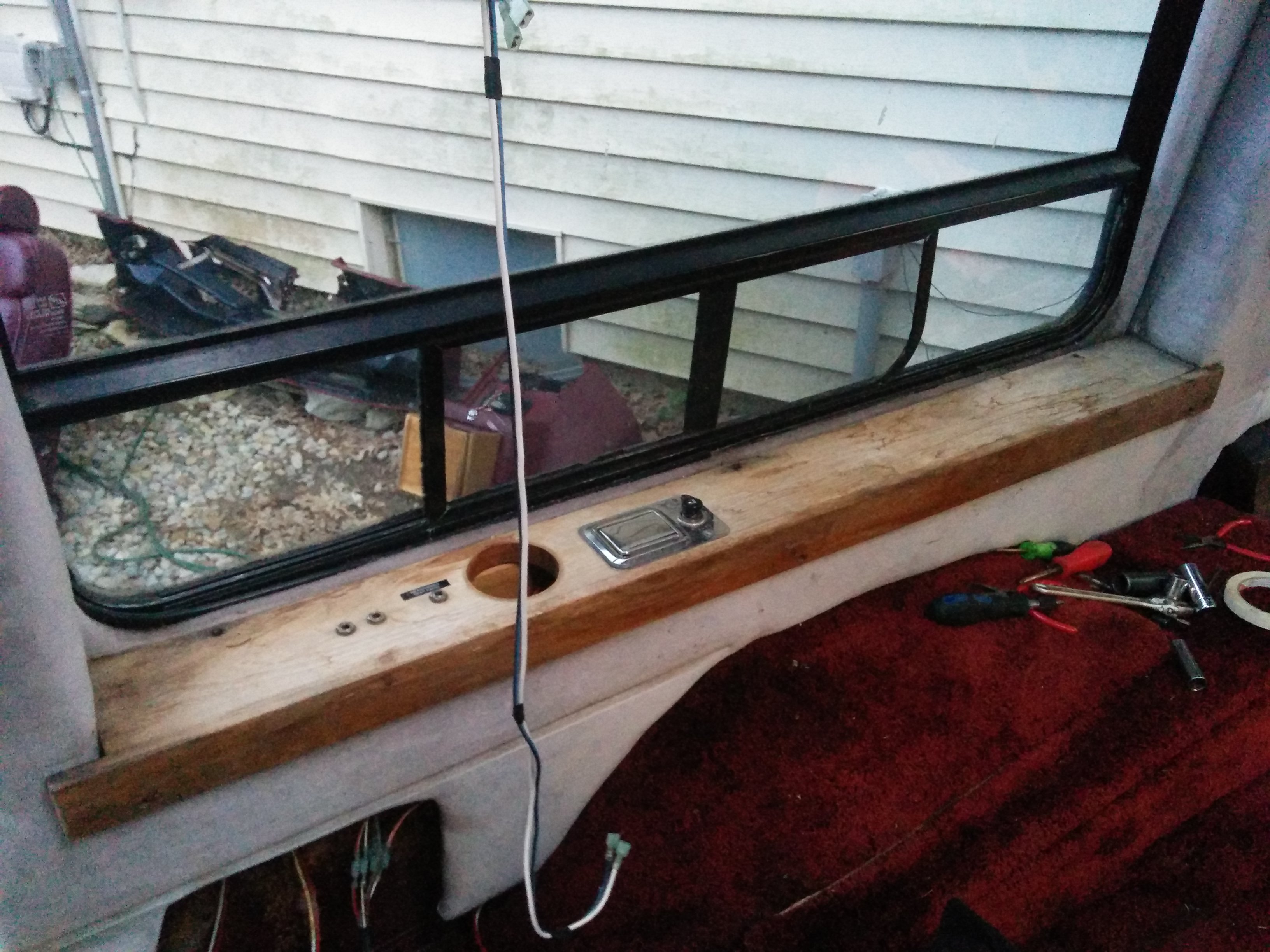 Another chunk of original van roof formed a shelf in the front, through which a hole had been drilled permitting cable access to the front deck.