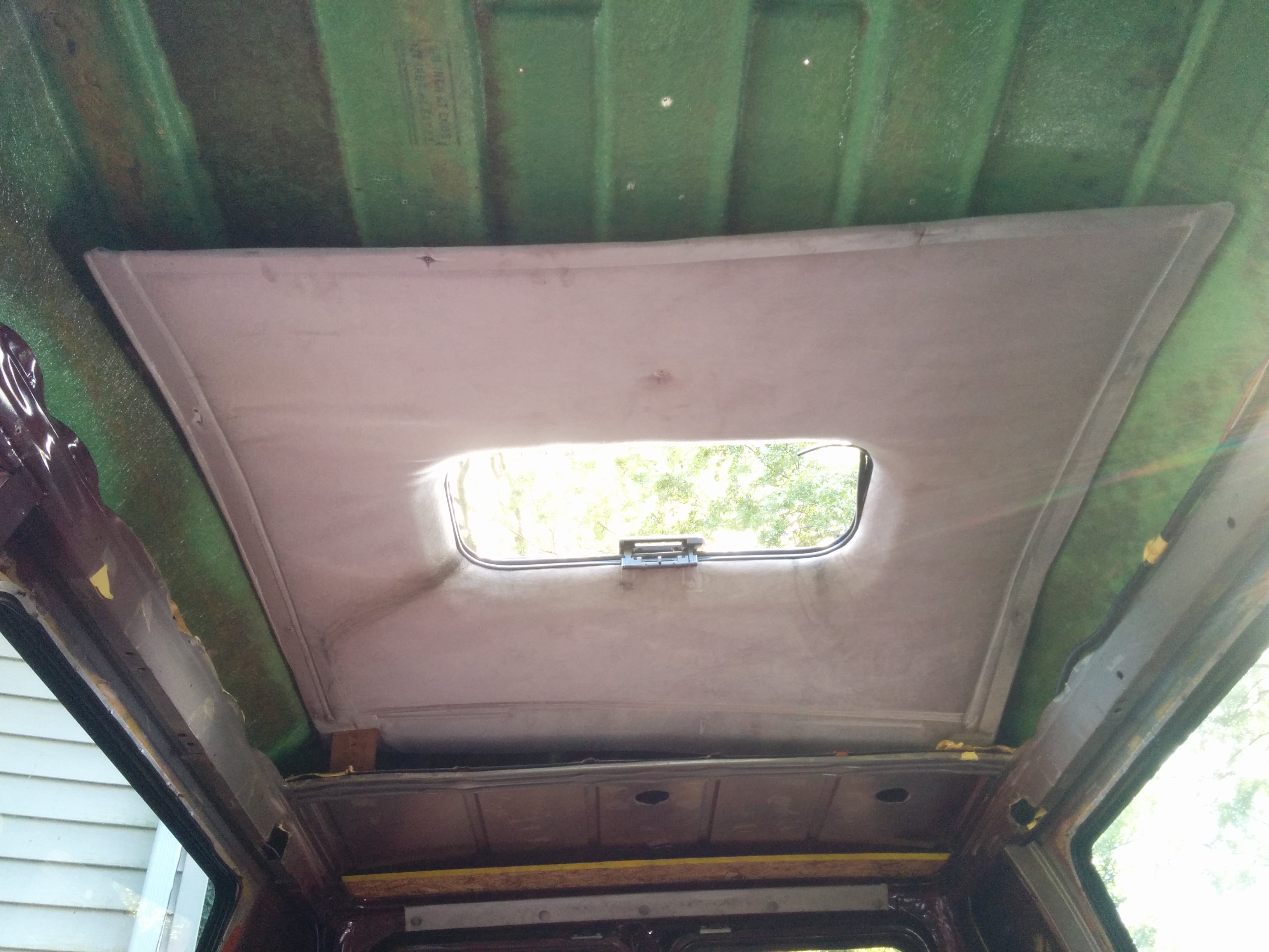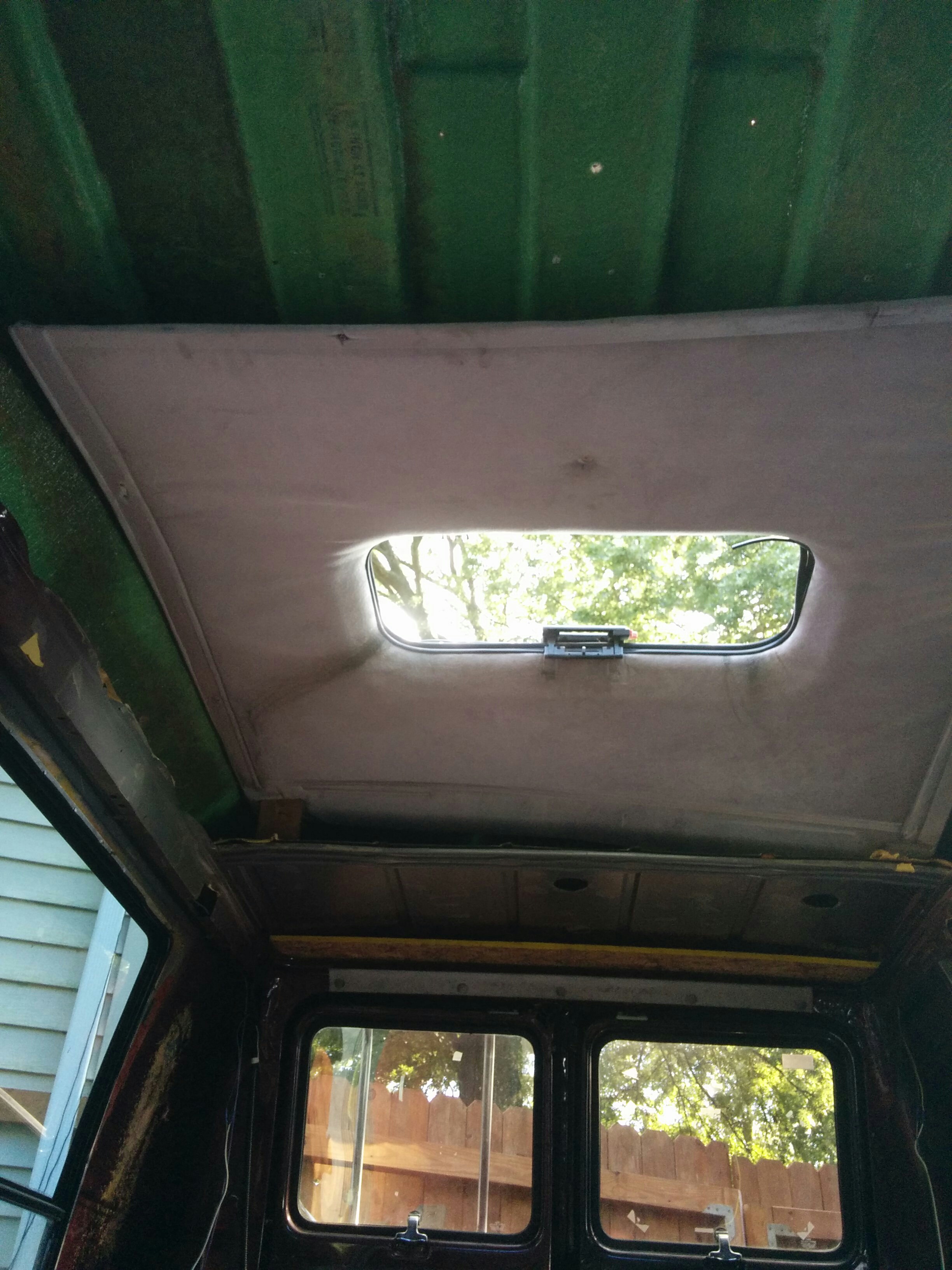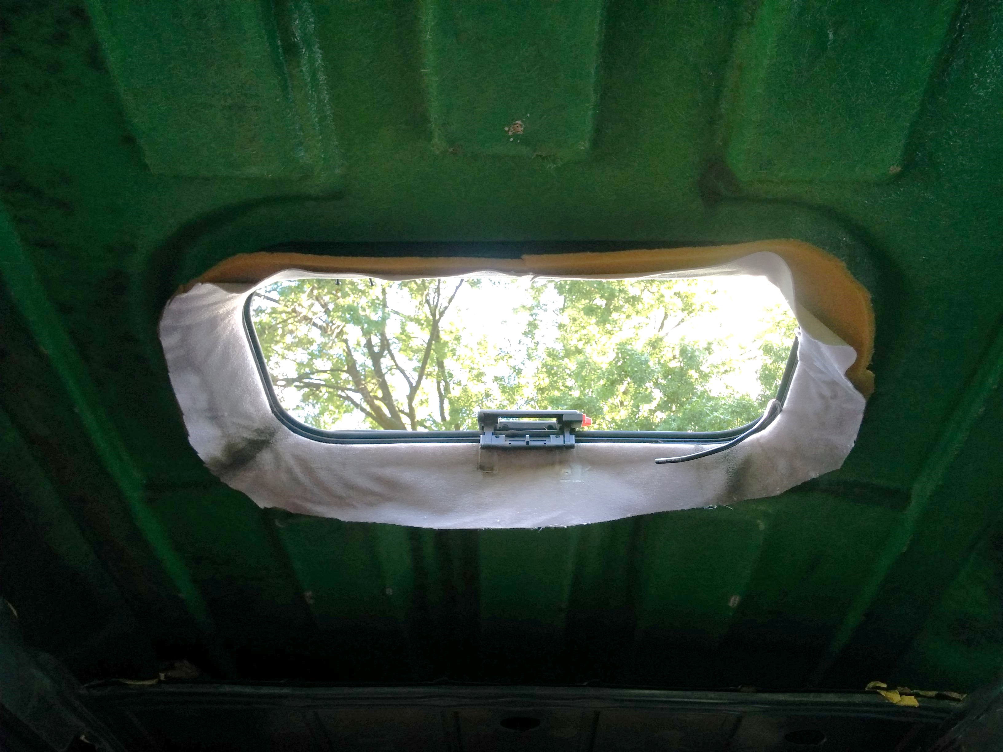 Last but not least was this obnoxious ceiling panel. You can see that the fiberglass roof surrounding it is a hideous green. It would have been nice to reuse this panel in some way (cover it with some sort of different fabric?) if they hadn’t superglued it to the sunroof. ;(
