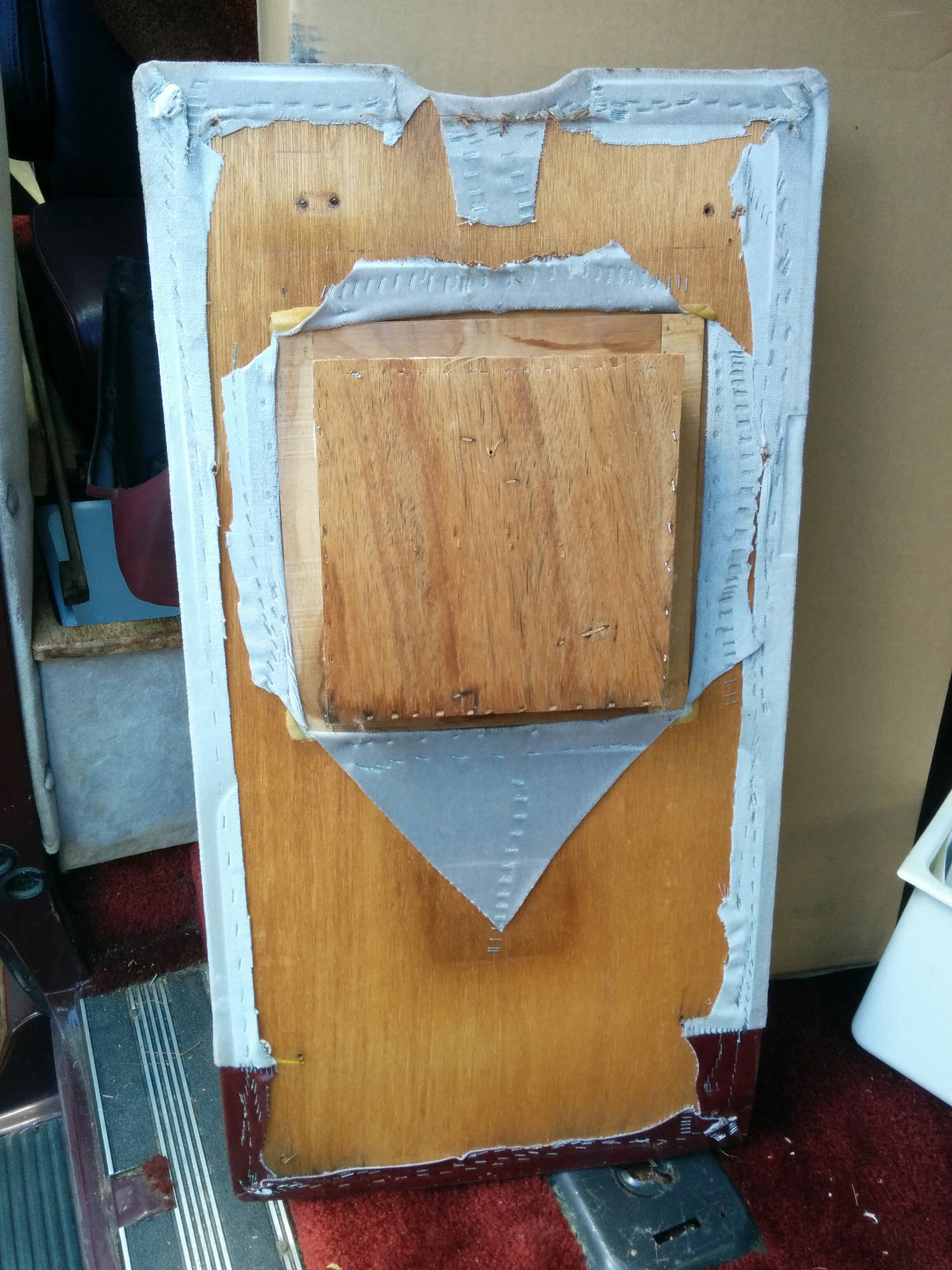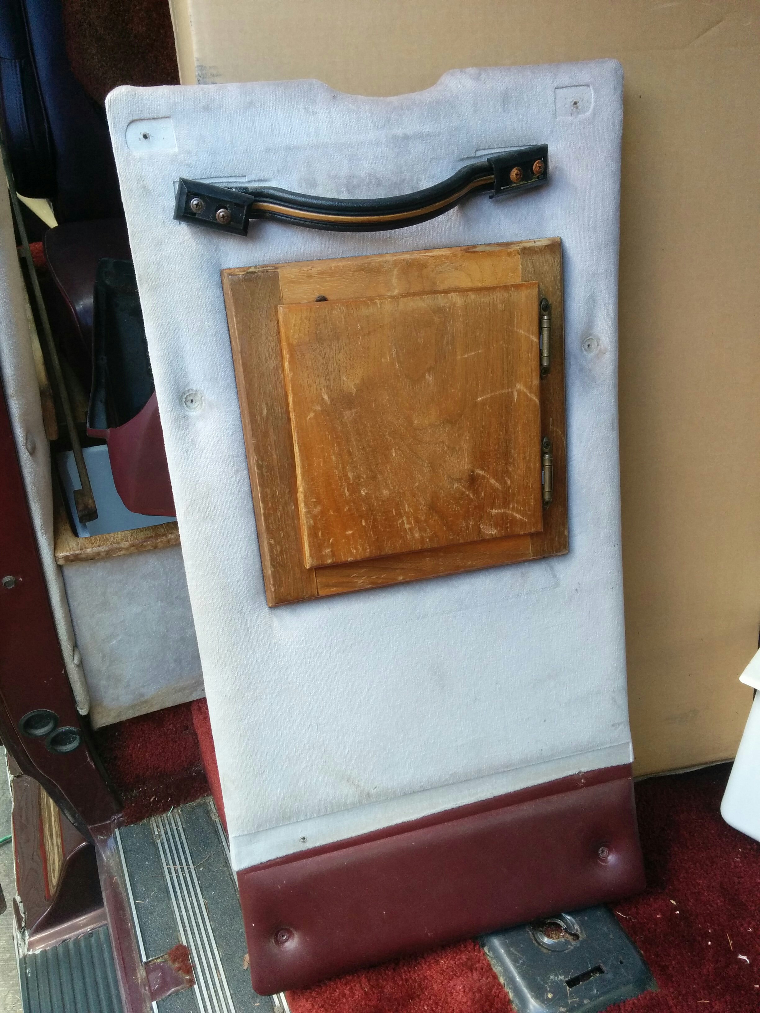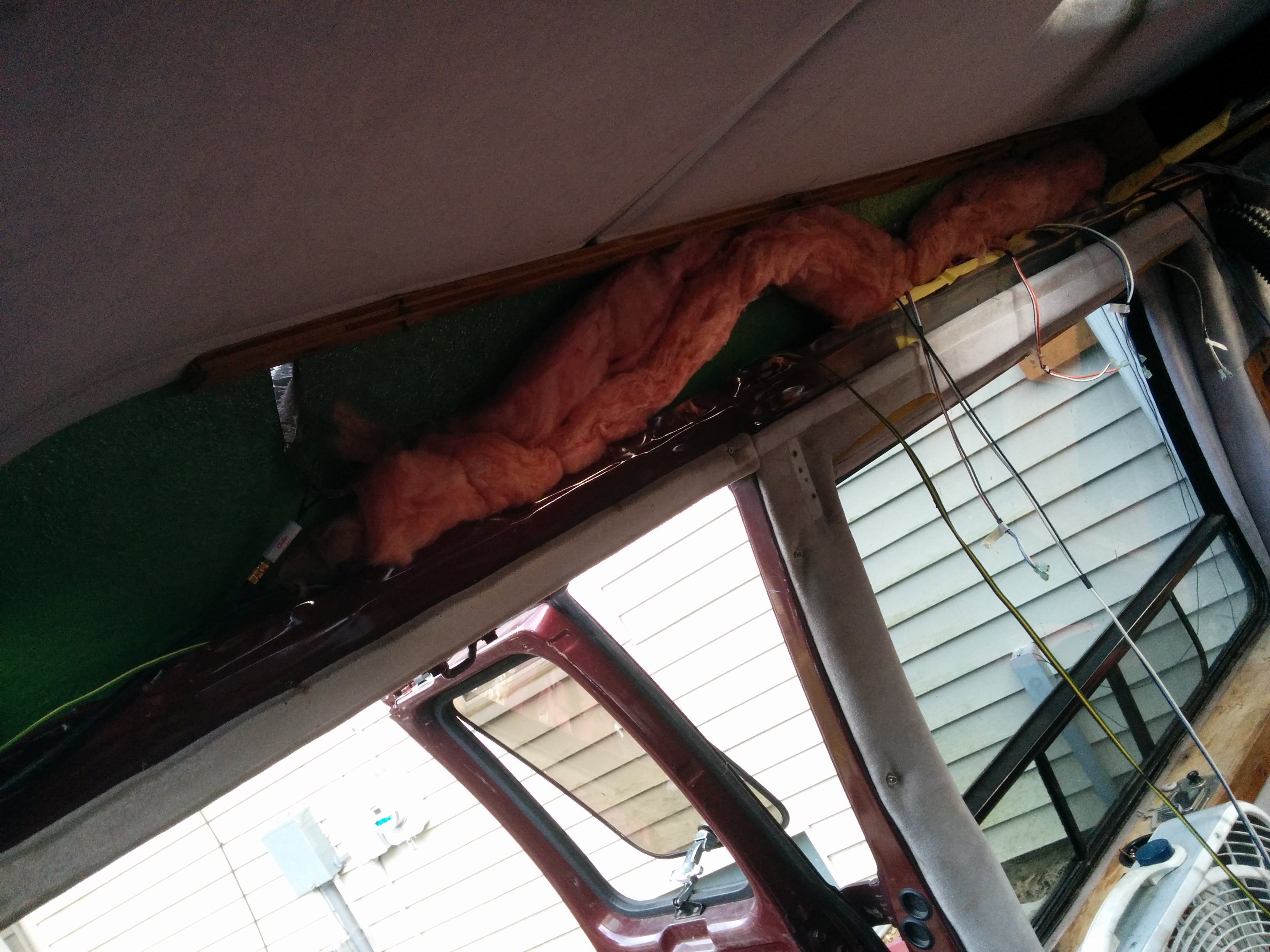 Last but not least was this obnoxious ceiling panel. You can see that the fiberglass roof surrounding it is a hideous green. It would have been nice to reuse this panel in some way (cover it with some sort of different fabric?) if they hadn’t superglued it to the sunroof. ;(