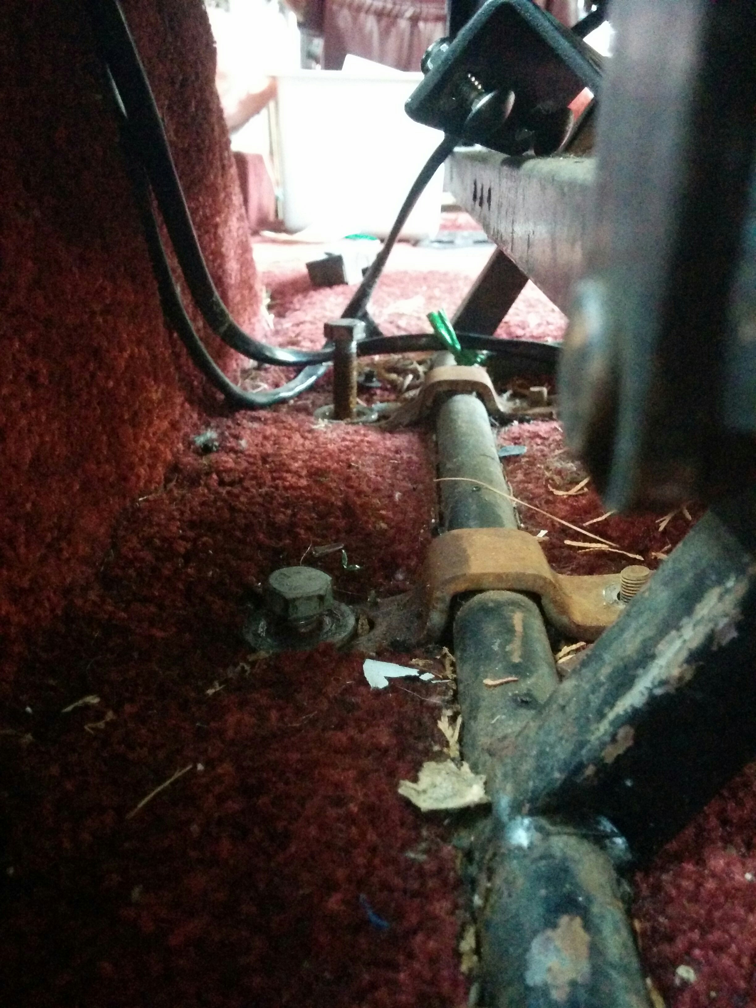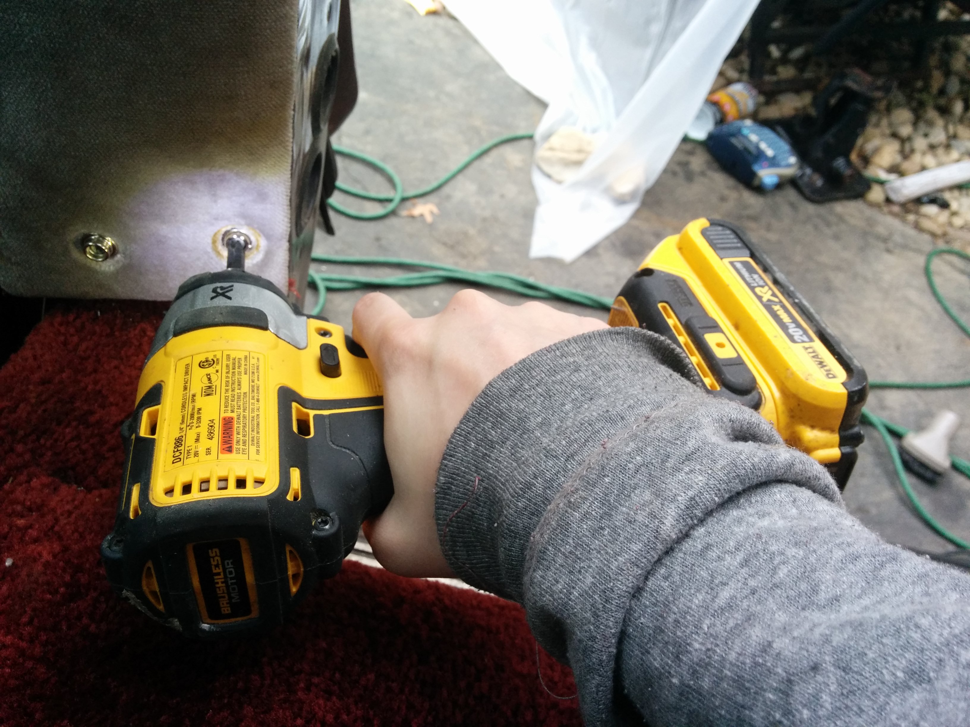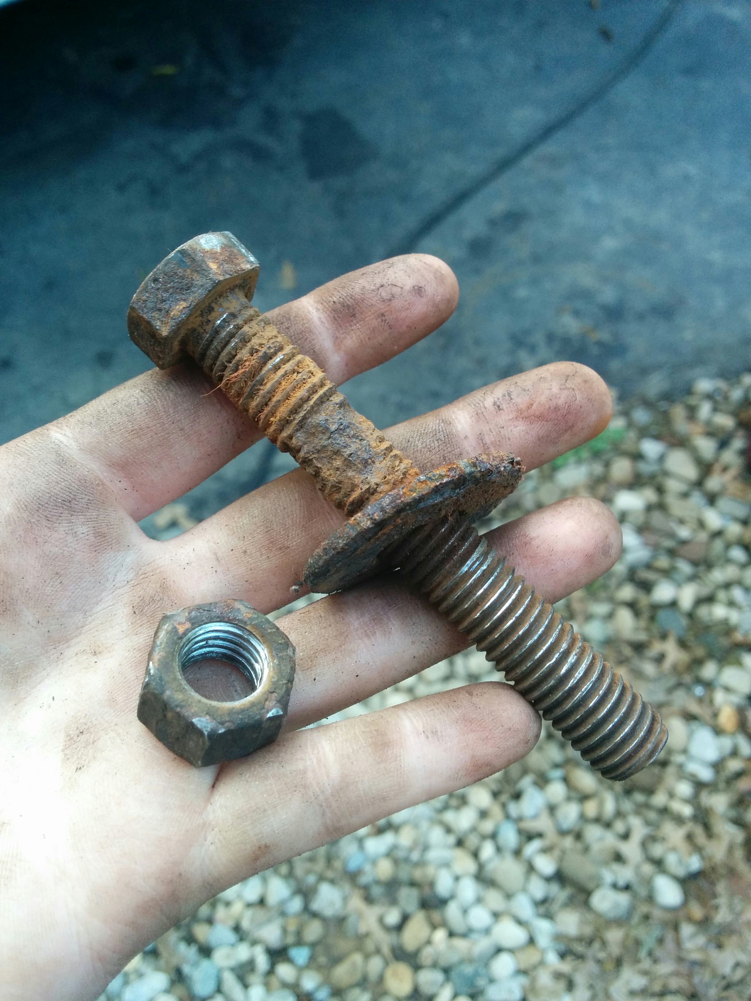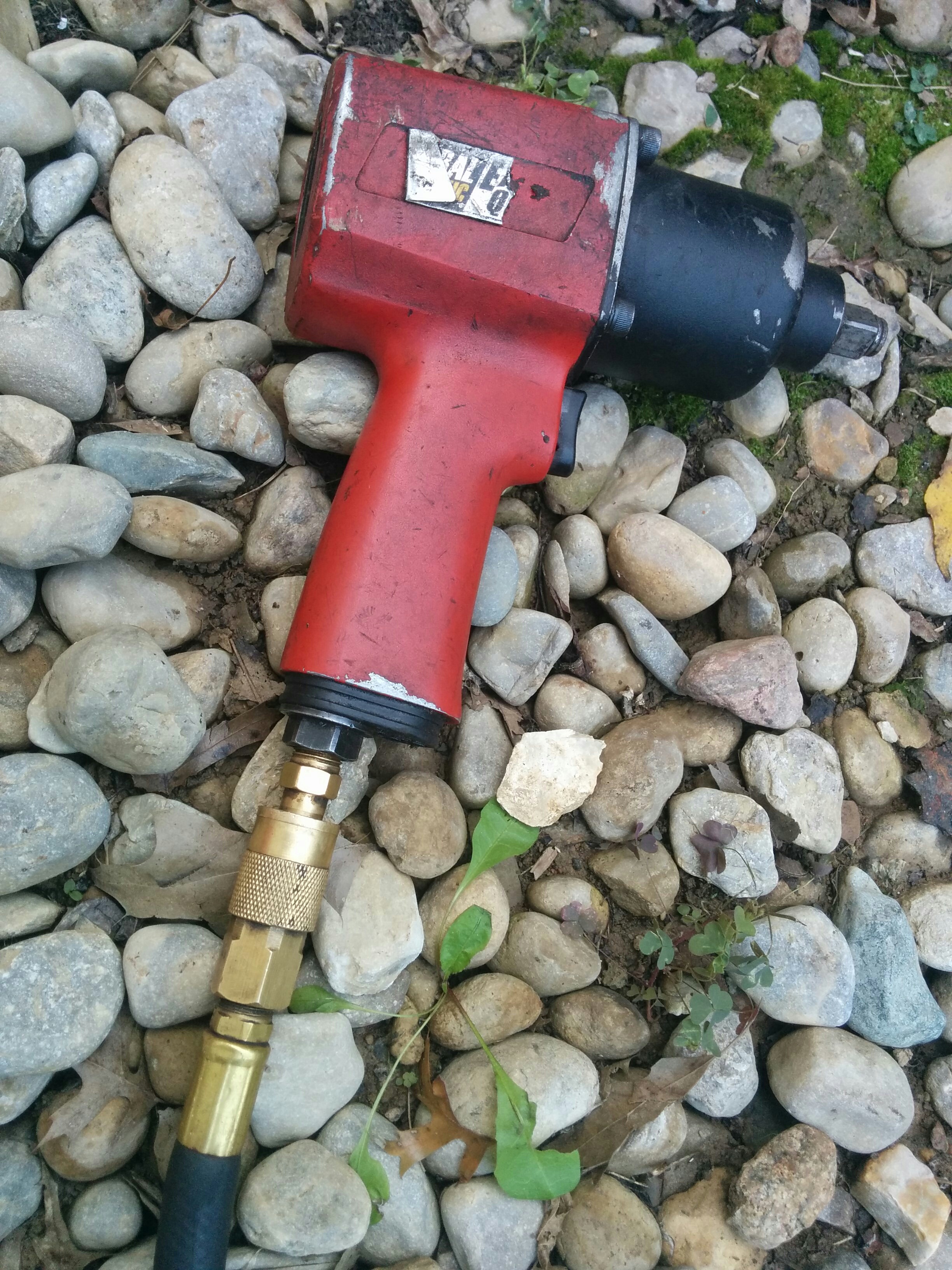I had not encountered these tools before. The thing on the left is an air tank powered “impact wrench” (which we definitely needed) and then on the right an “angle grinder” (for cutting the bolt off, if it came down to it, which iirc it did not). This would become a common theme with the van: everything was stuck in place somehow, typically by rust, making simple tasks into difficult battles.