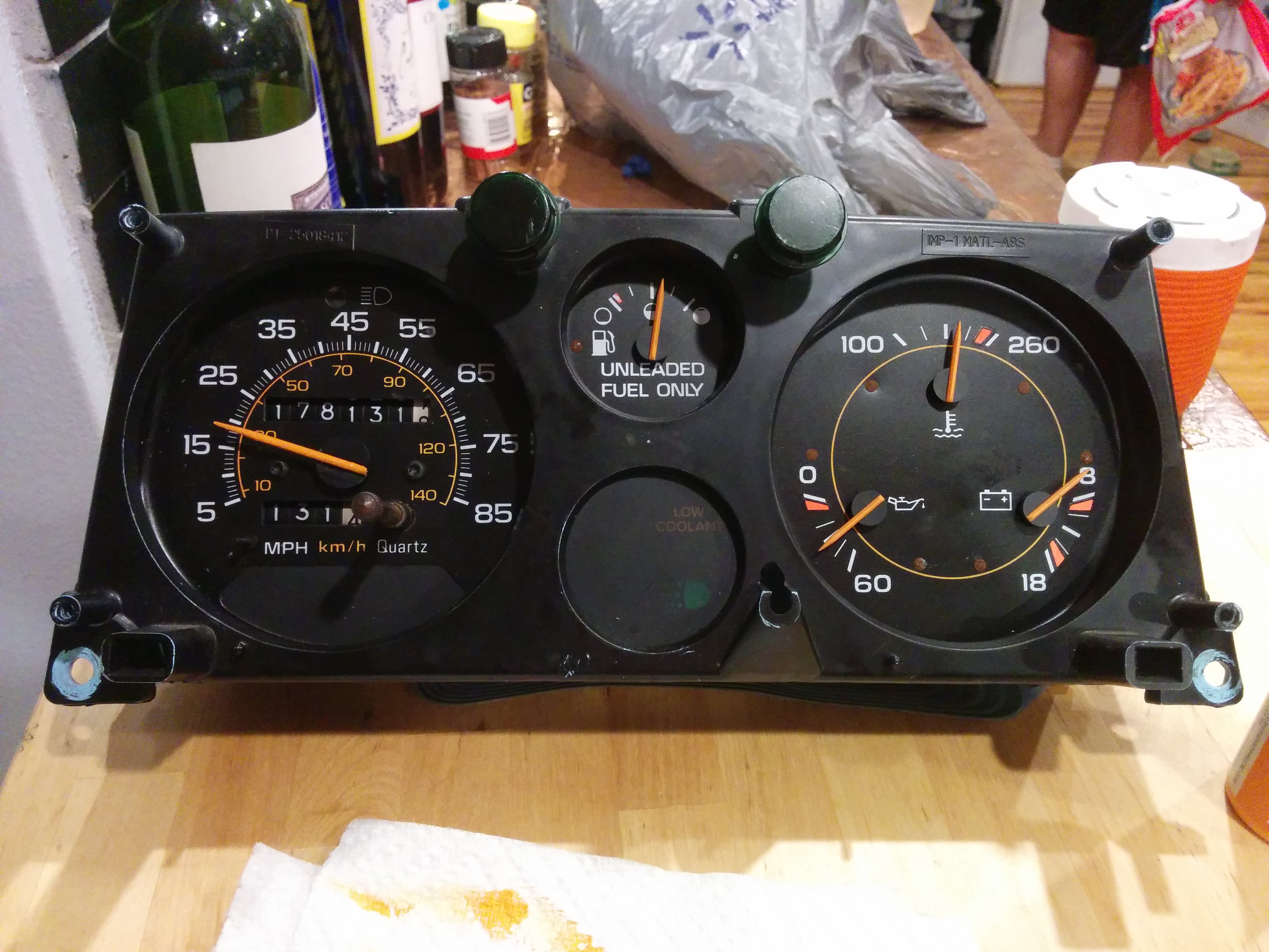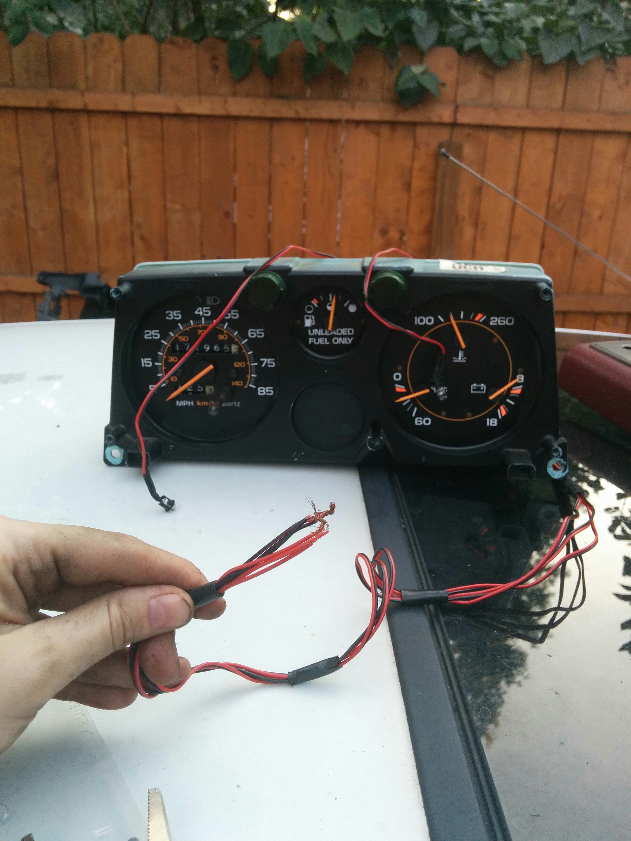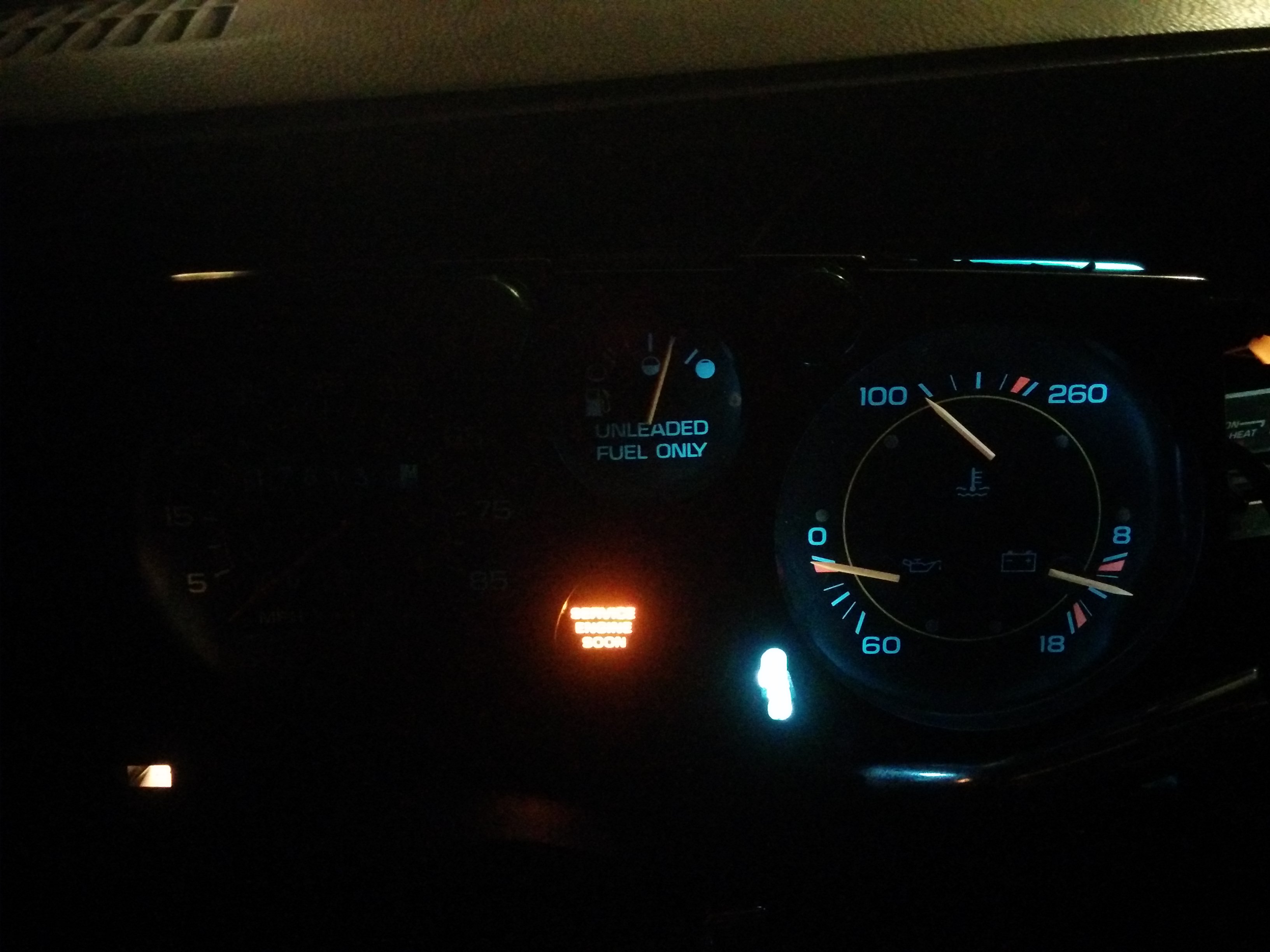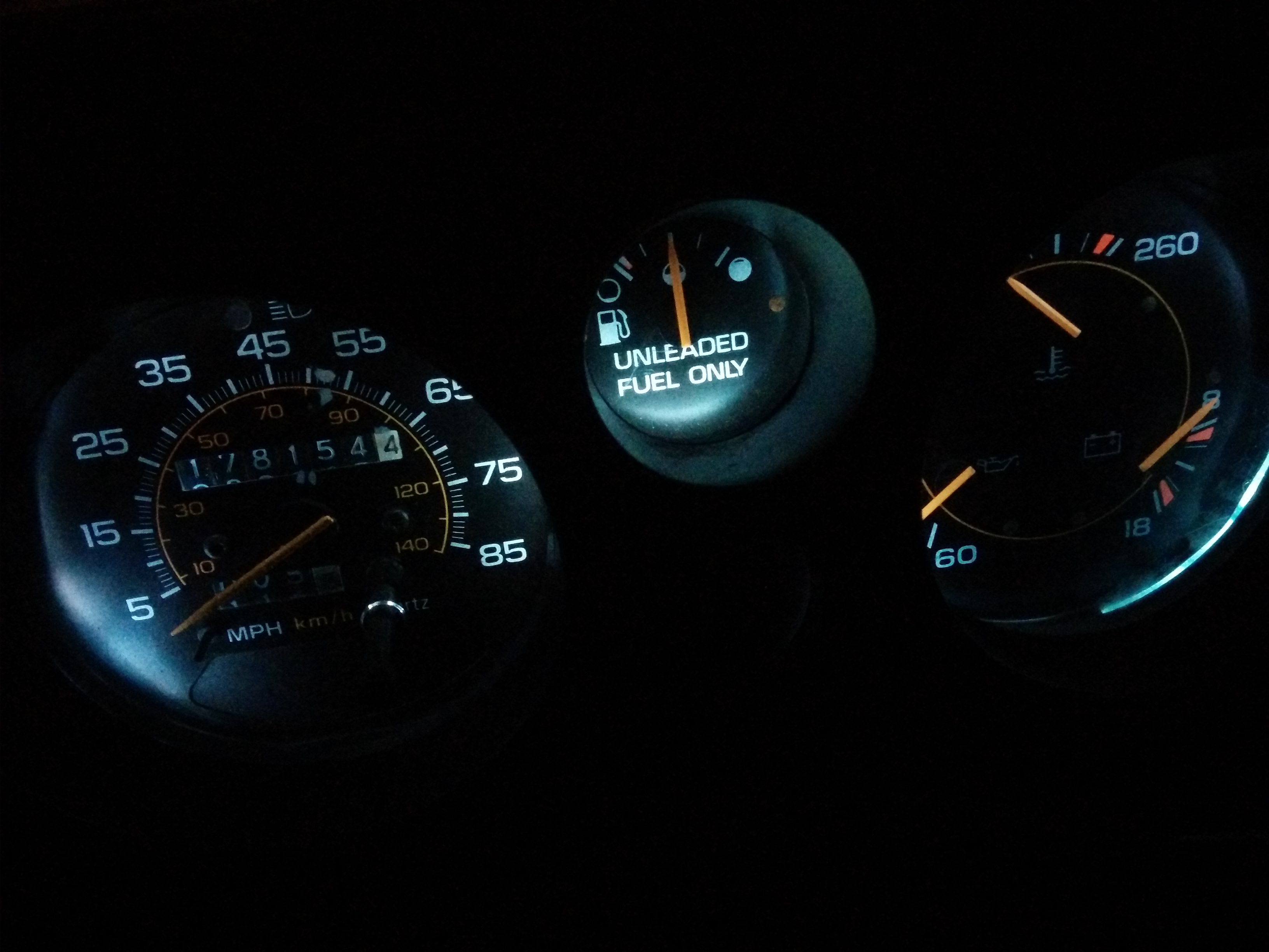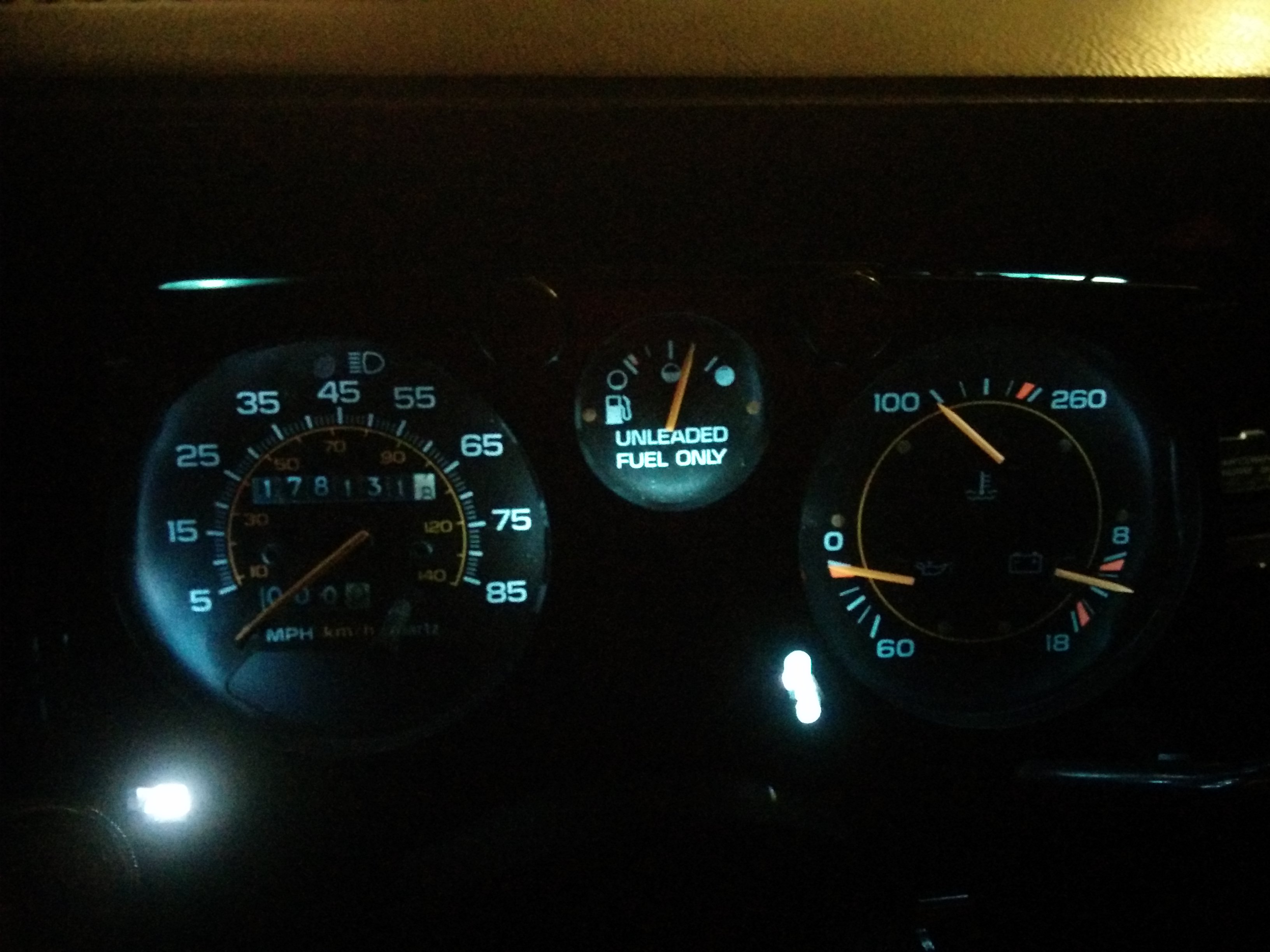 One reason I had removed the wood paneling around the gauge cluster so early on was that even during the day, the gauges were difficult to read because the backlighting was incredibly weak. In retrospect, some of the dimness was probably attributable to the ailing battery/alternator system, but even with that resolved the lights were still just too dim. Googling around, I found a few things I could try to lighten things up.