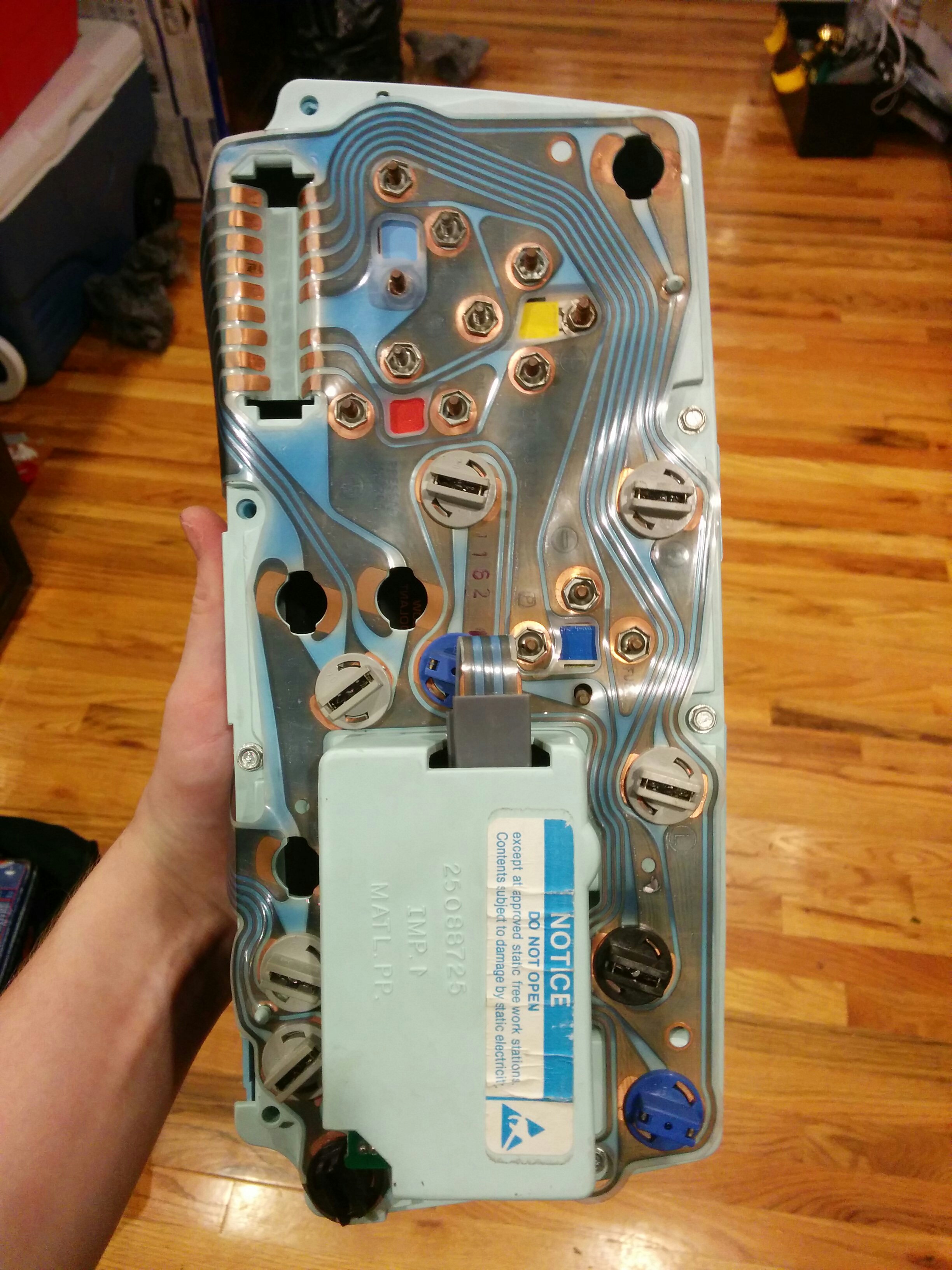 The little nubs on the back here in blue, silver, and black are the light bulb holders. The colors (may) signify the strength of the bulb within, but leds don’t shed heat in the way that incandescents do, so this was less relevant for me (and I had the photo to refer to if needed). The bases twist out and twist in. A few of mine were pretty tough to get out. :/ They take “wedge base” bulbs and these ones specifically are T10s. You can pull the old bulbs out and buy LEDs that slot right in where the incandescents used to go.
