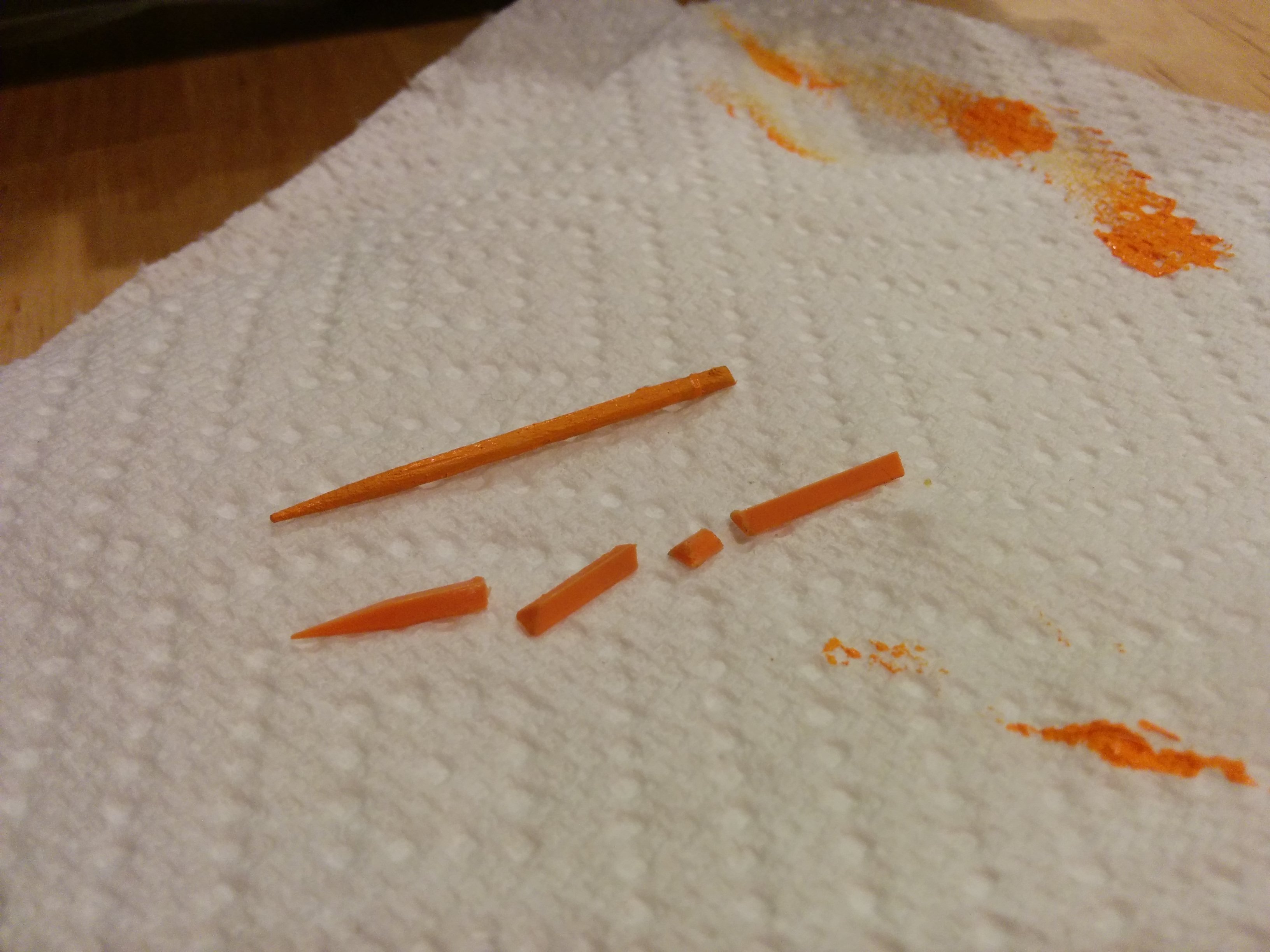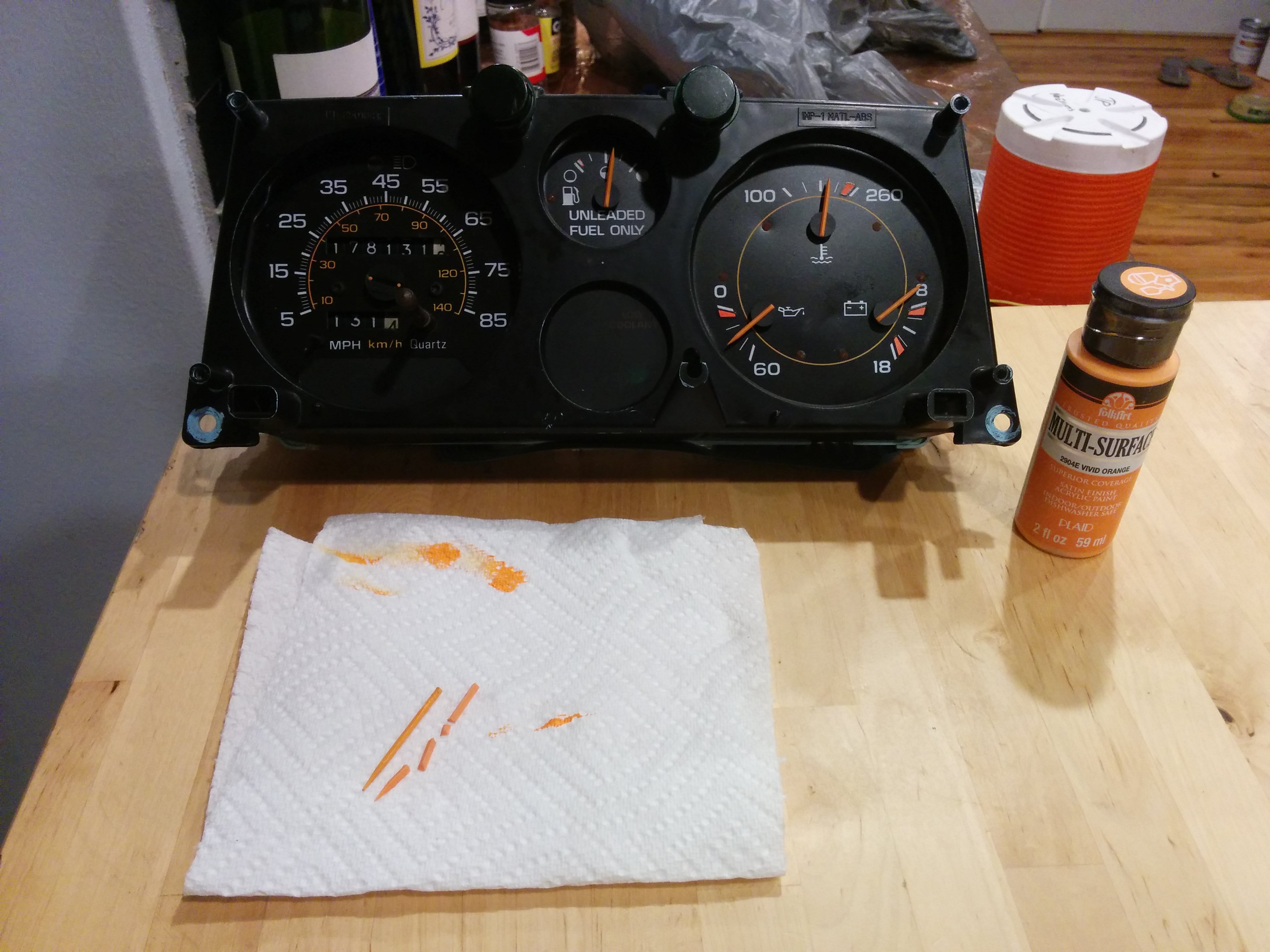 I cut up a tooth pick, painted it orange, and carefully superglued it where the original indicator had been. (I needed to put it in the same place or else the spedometer would be full of lies from then on.) I eyeballed the shade of orange in the Walmart acrylic crafts section so I was pleased to have nailed it correctly.