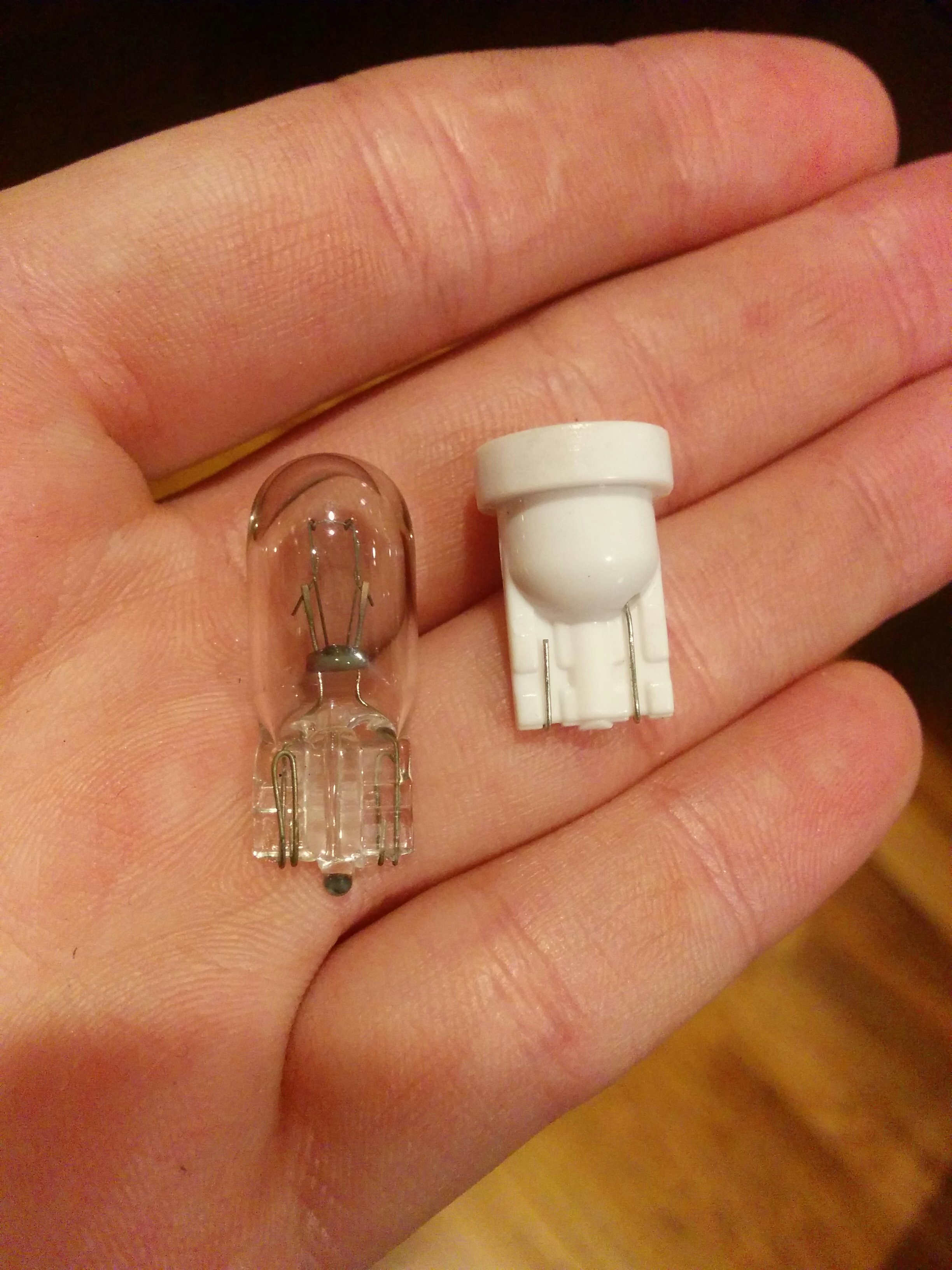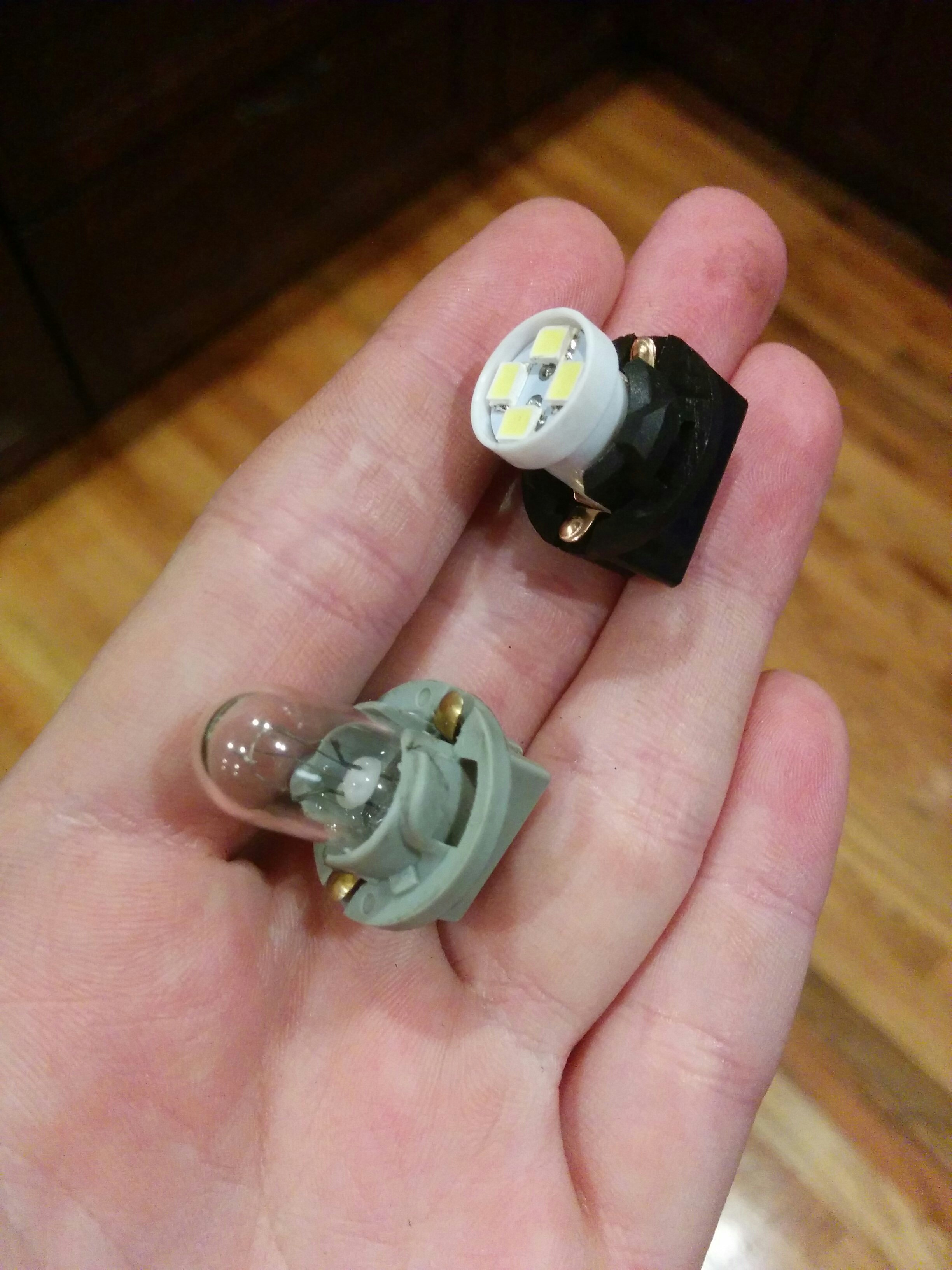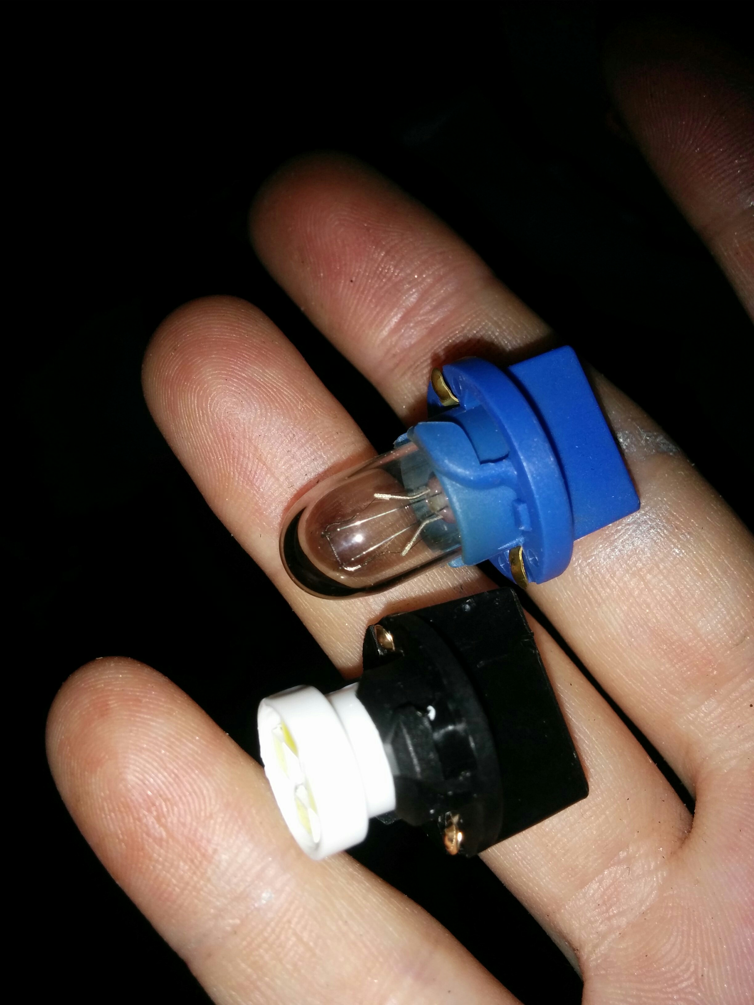 I got these supremely unvetted “8PCS LED Car Lights Bulb White T10 2835 4-SMD 80 Lumens 194 168 (pack of 8)” for $6 on Amazon. Note that the rheostat math changes when the resistance does, so you are likely to lose all of your dashboard dimmability unless you specifically hunt down dimmable leds in the correct form factor. Thankfully the default brightness of the leds I got didn’t bother me (despite being generally rather light sensitive), but it’s something to be aware of.