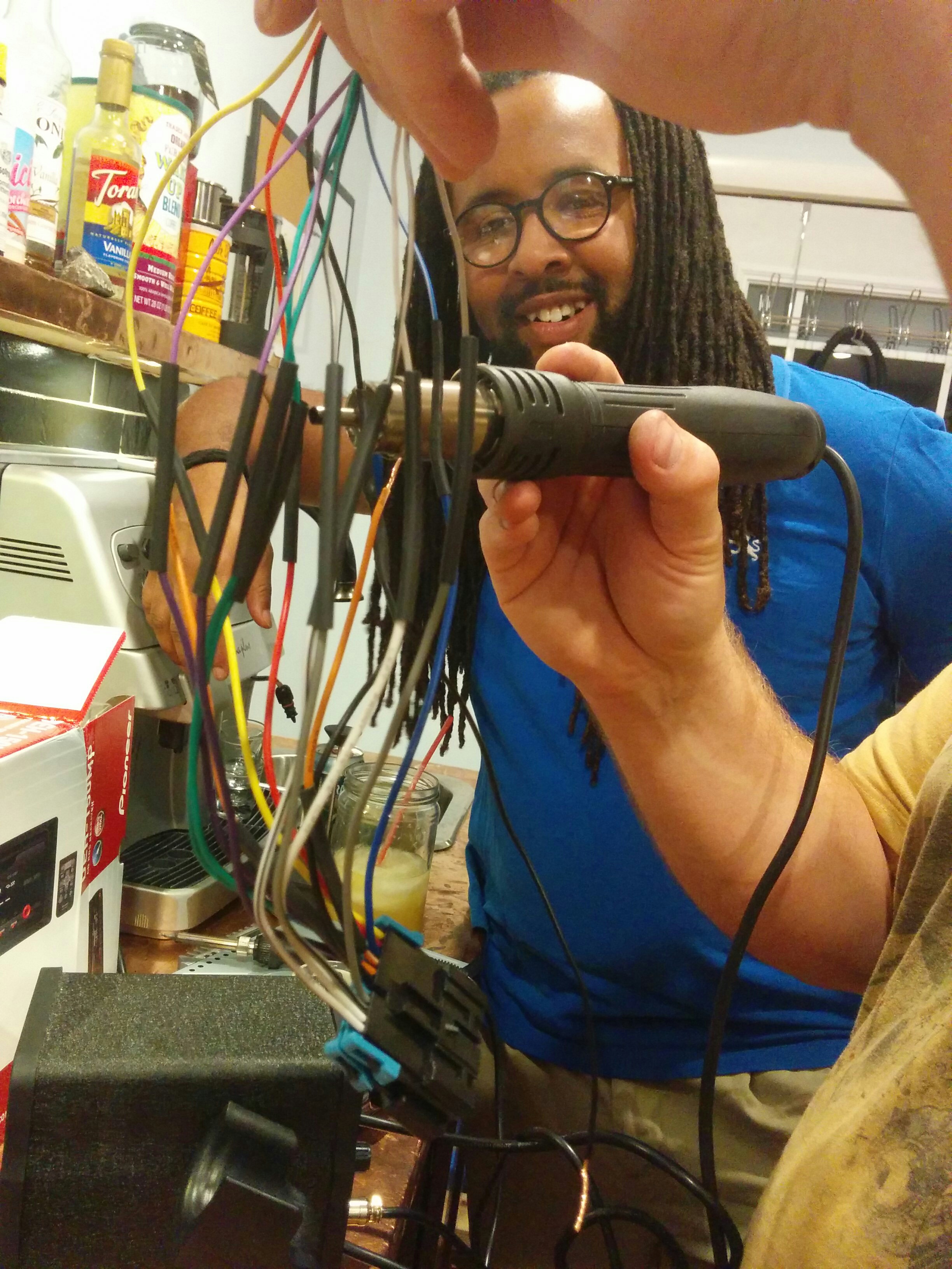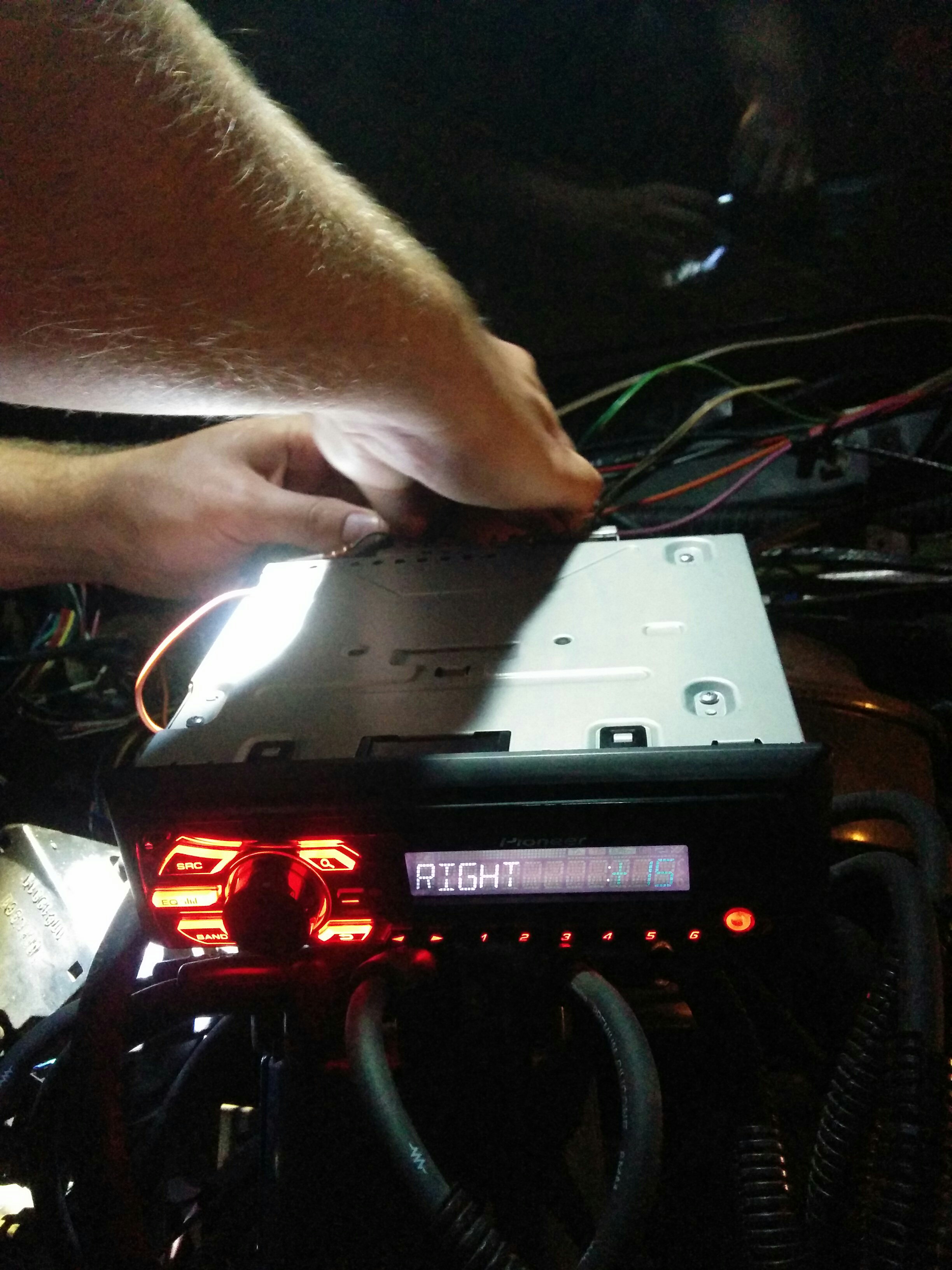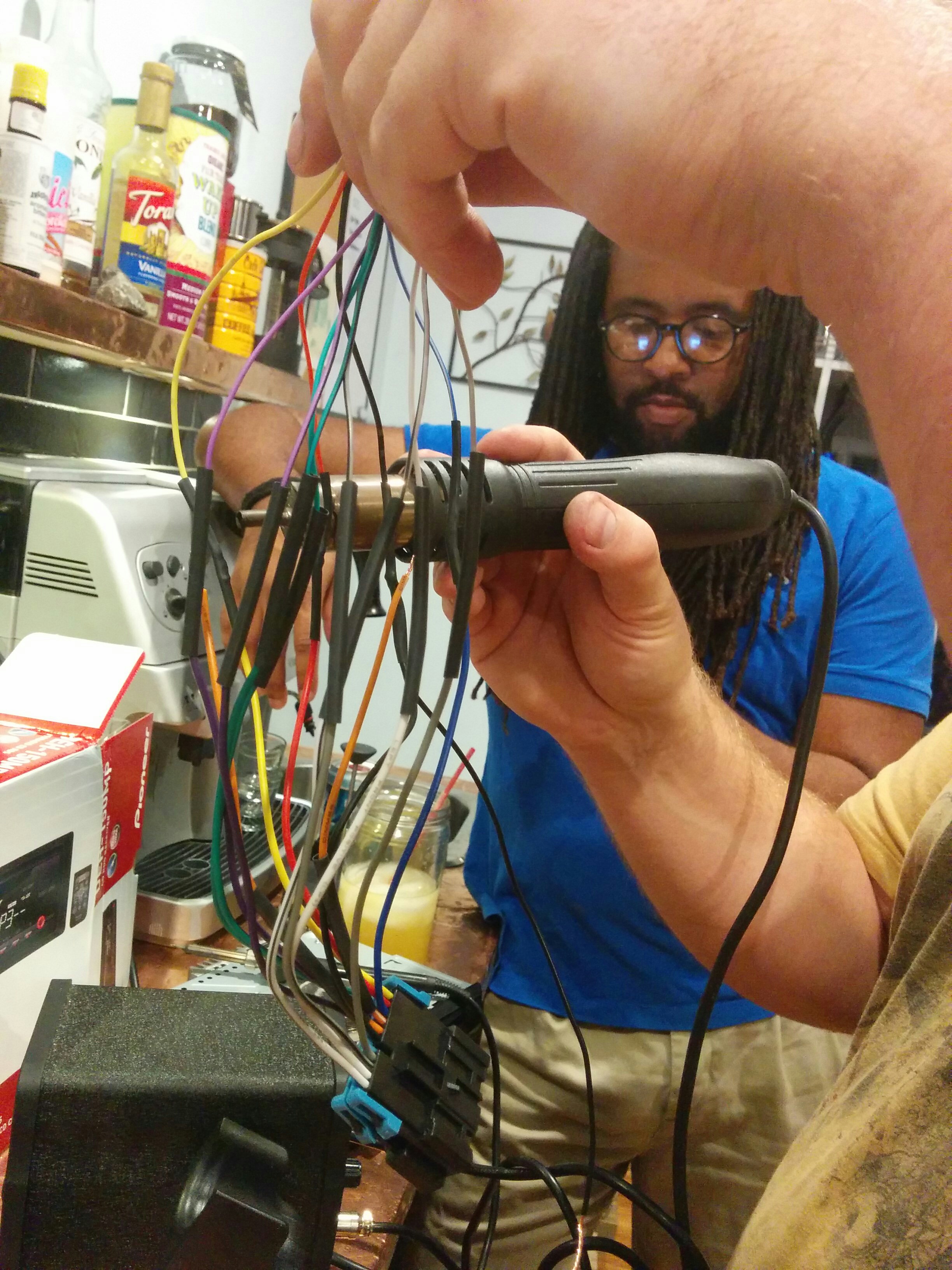 I’m not sure how many radios Garrett has installed on cars but I got the feeling that it was probably a lot. He was alarmingly fast at it. He nonchalantly tossed all the pinout charts to the side without even really looking at the them and blazed through A/B testing different combinations of wire placements until the sound turned on in the right place at which point he would secure the wires and move on.