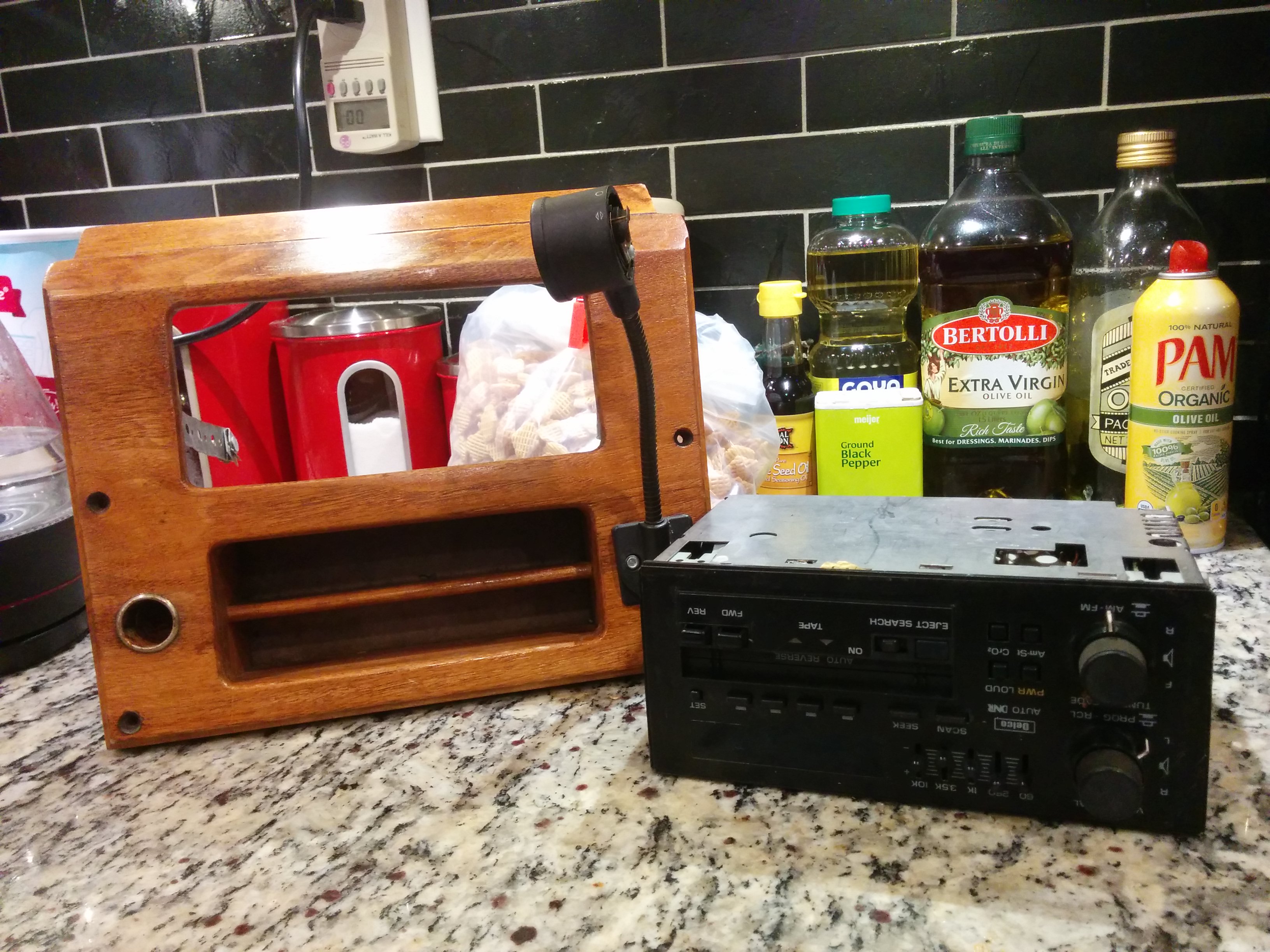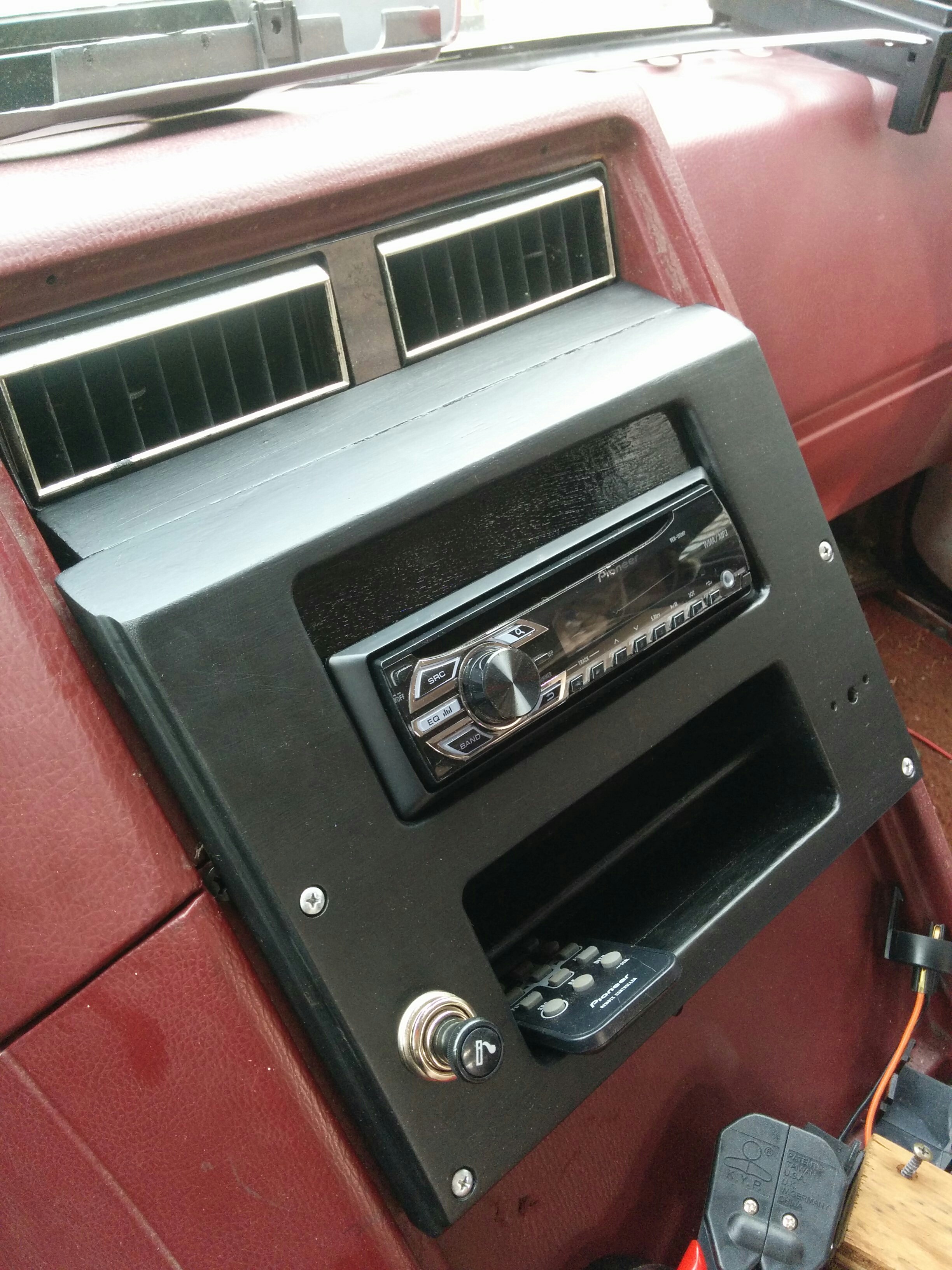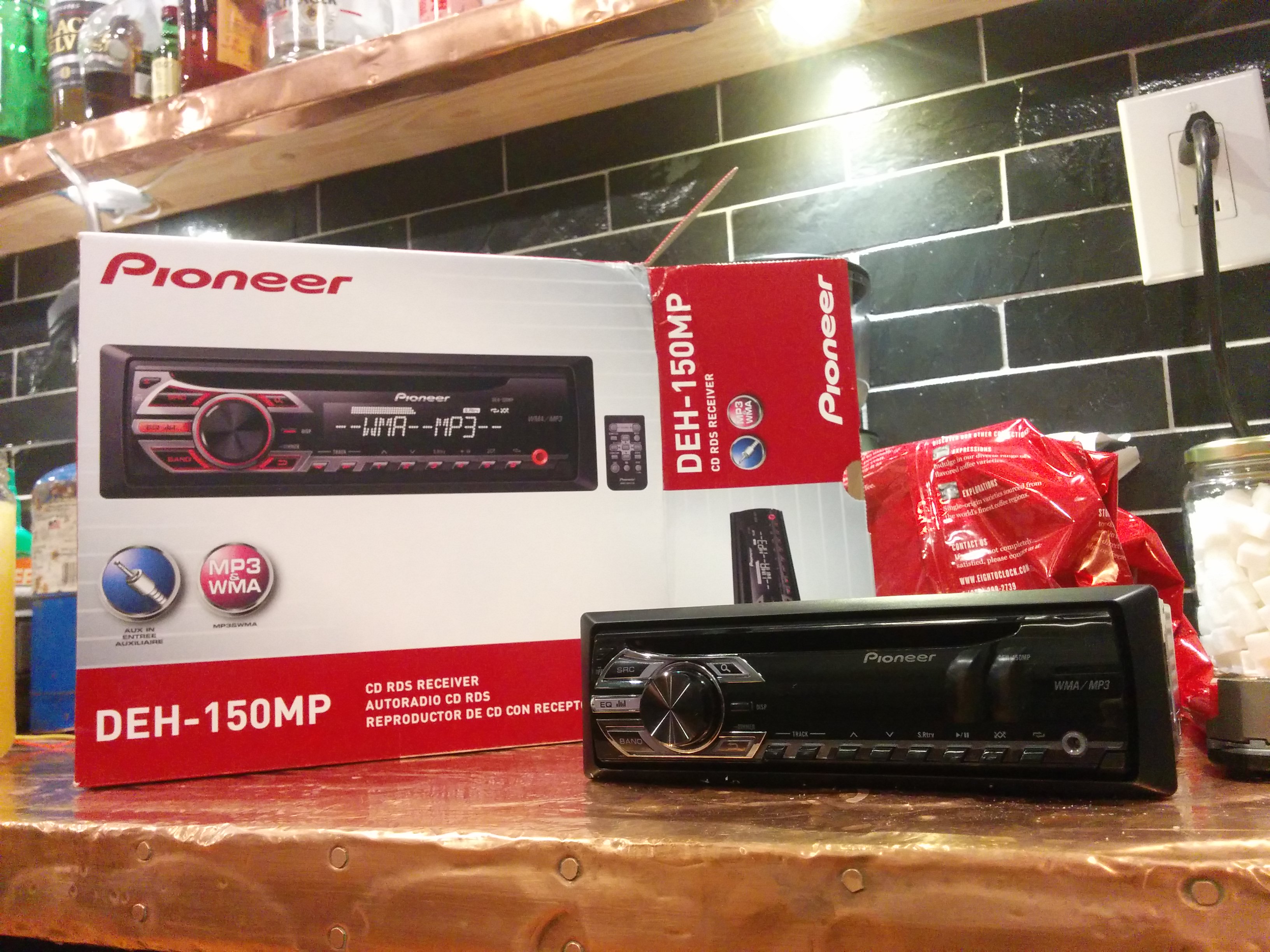 The radio I got was a $60 Pioneer DEH-150MP. The functionality suited me and the color scheme pleased me. To install it, I had to order a “Metra 70-1858 Radio Wiring Harness For GM 88-05 Harness” ($5) and a “Metra AW444GM Gm Multi-Kit 1982-Up].” ($14) I am 75% sure we used at least one piece of the adapter kit. There are a few different form factors for radios. The old radio was a “double DIN” and the new one was a “single DIN,” which meant it took up half the vertical space compared to the old one; I would need to find something to fill in the “hole” left by the larger original radio. I ended up using a scrap of hastily spraypainted luan paneling to fill in the area left vacant by the smaller radio.