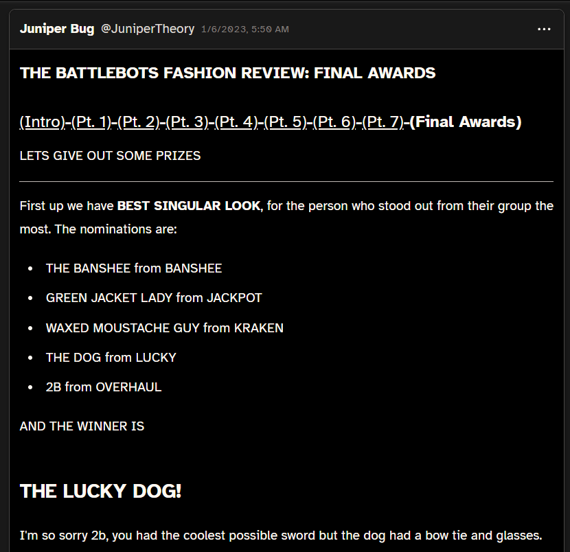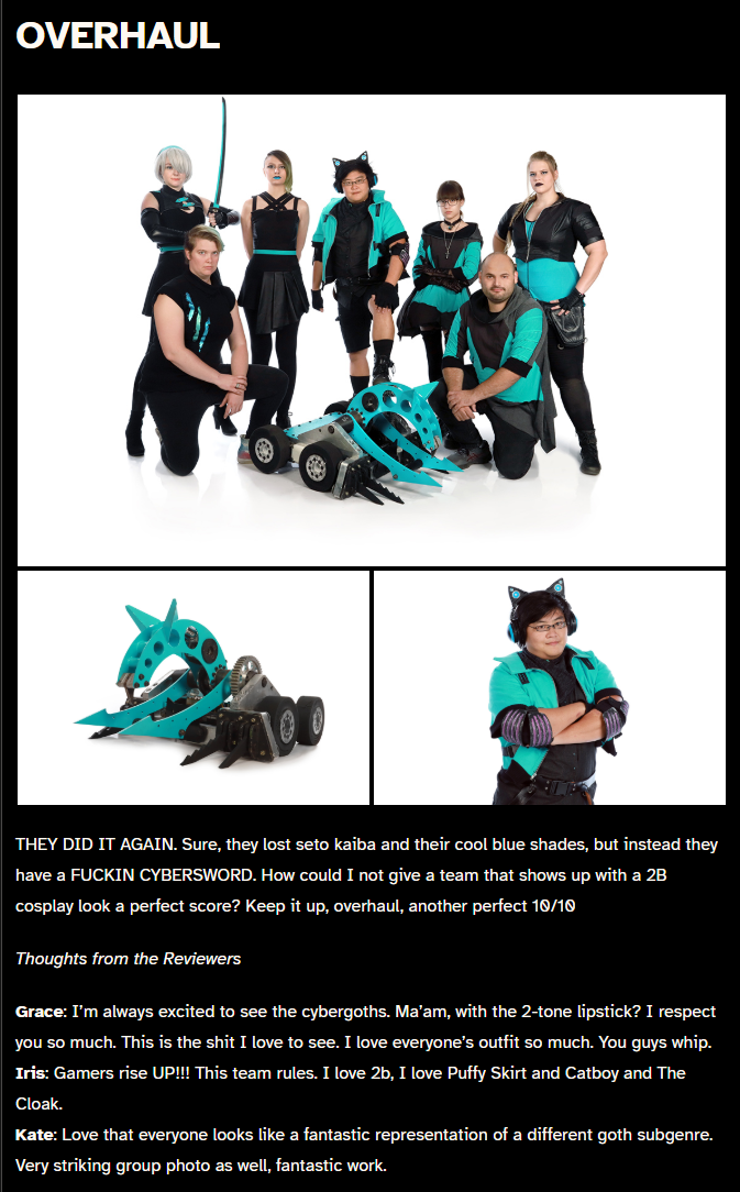 Charles asked me to be on his Battlebots team right as I had just finished playing Nier:Automata through ending E for the first time. Naturally my mind went straight to combining the two. The desert filming location, the machine mayhem, 2B being a robot-killing android…it was just all too fitting. At the time I was also growing out my natural hair color, so wearing a wig would help cloak the awkward transition period as opposed to immortalizing it in television history.